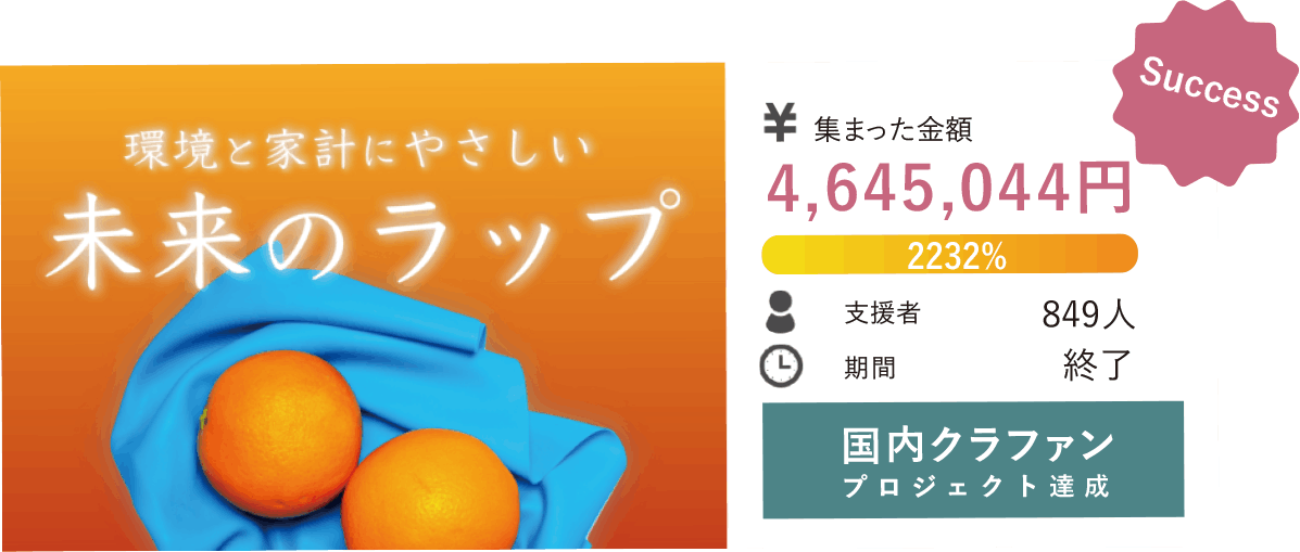 実はこのラップ、国内クラウドファンディングプロジェクトにて、わずか1ヶ月あまりで849名の方々からご支援をいただき、支援額4,645,044円、目標額の2000%を超える大成功を収めた製品です。