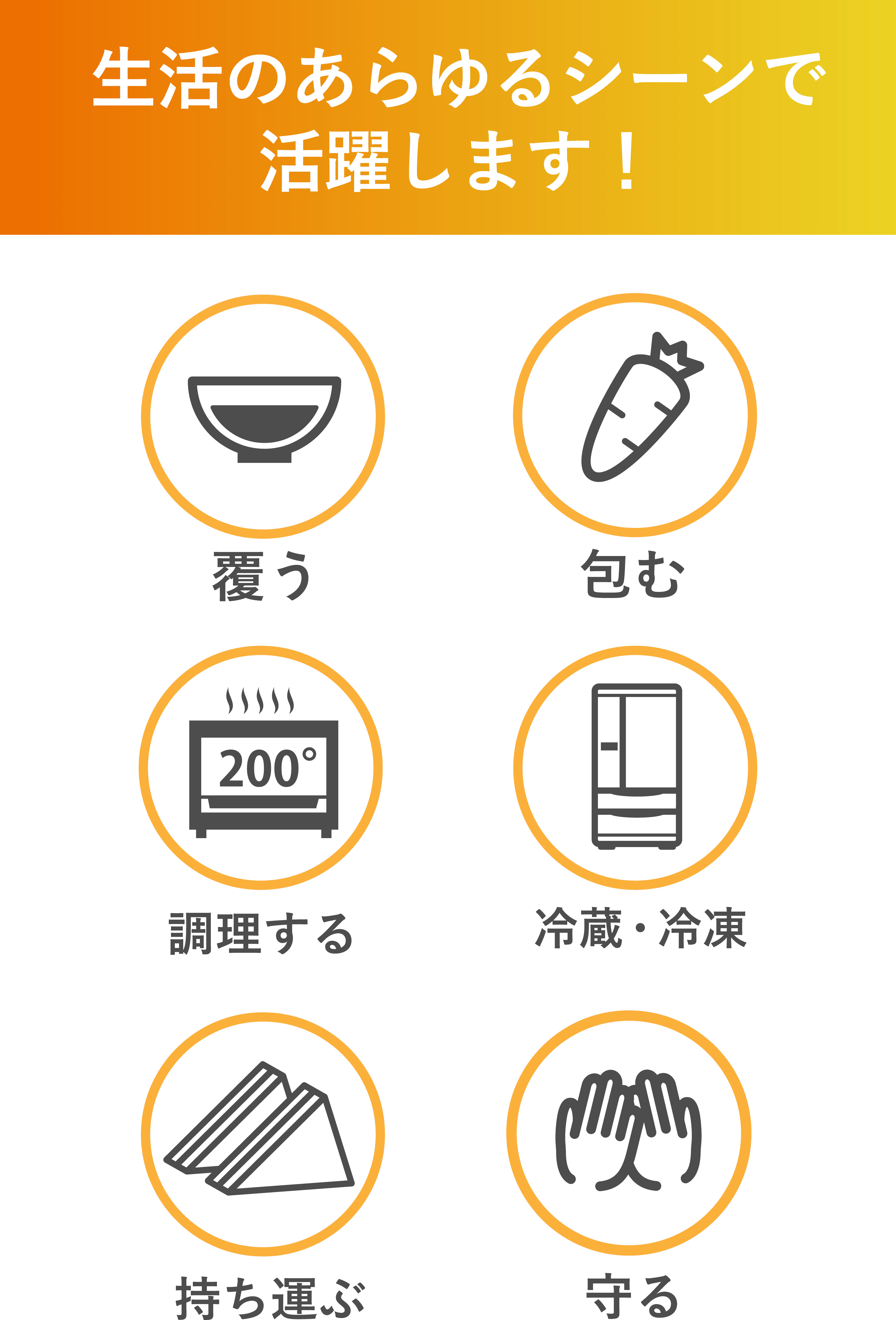 お皿やボウルにのせれば、気密性の高い空間を作るため、料理をいつでも新鮮な状態に保ち、いつもより長持ちさせることができます。