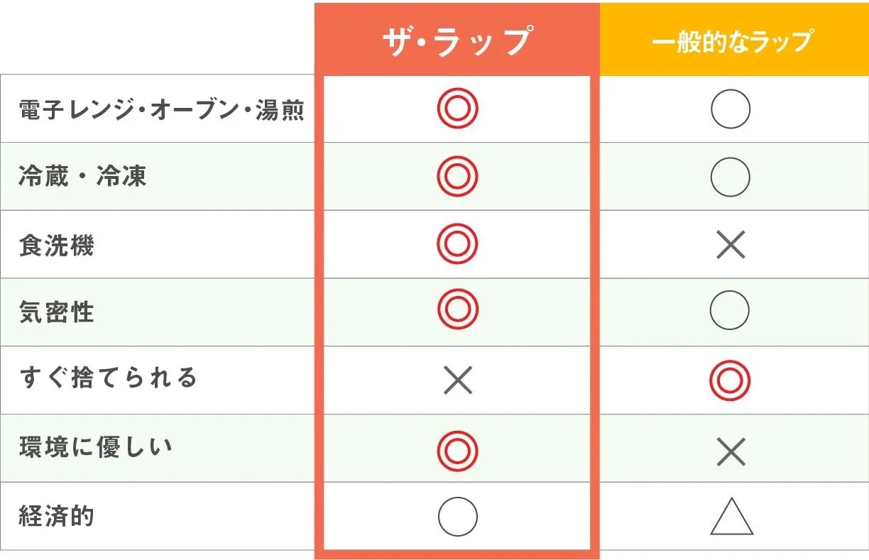 一般的なラップだと耐熱できるのは140℃までですが、ザ・ラップは-40℃~235℃まで使用可能!使い捨てラップにはない驚異的な耐熱性、耐寒性があります。