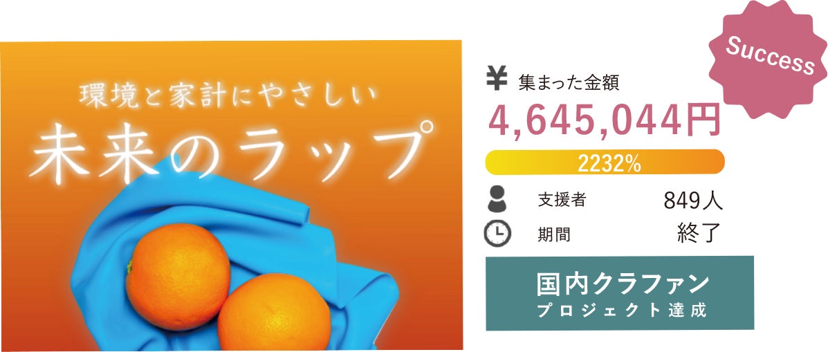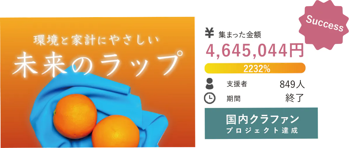 実はこのラップ、国内クラウドファンディングプロジェクトにて、わずか1ヶ月あまりで849名の方々からご支援をいただき、支援額4,645,044円、目標額の2000%を超える大成功を収めた製品です。
