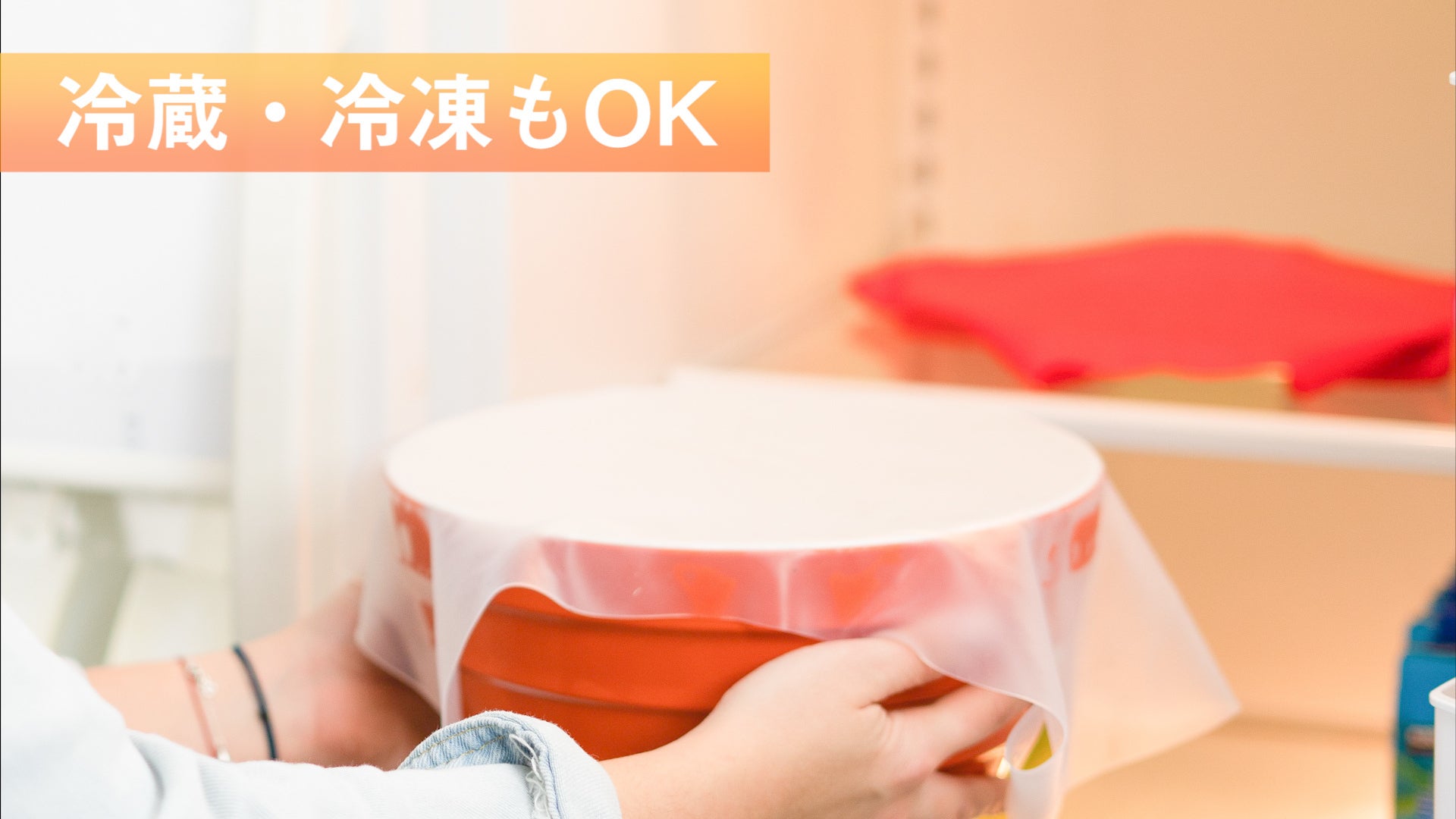 (※容器やラップが濡れたままのご使用、貼り付けのストレッチが甘い、特殊な形状や一部の容器で張り付きにくい場合がございます。)