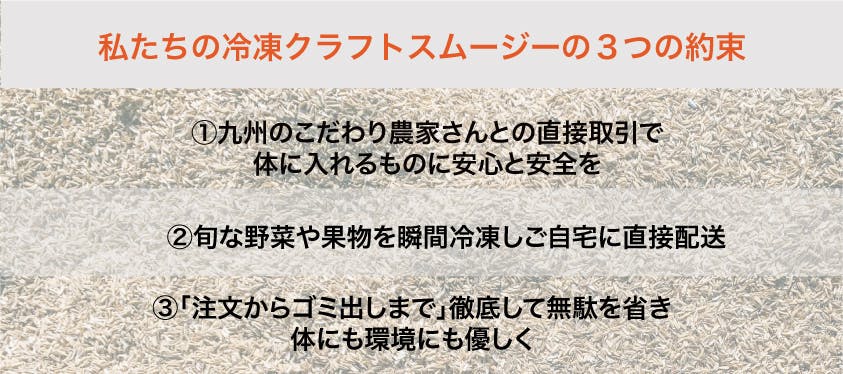 また私たちの3つの約束にも書いた「注文からゴミ出しまで」徹底して無駄を省き、体にも環境にも優しいスムージーになっています。