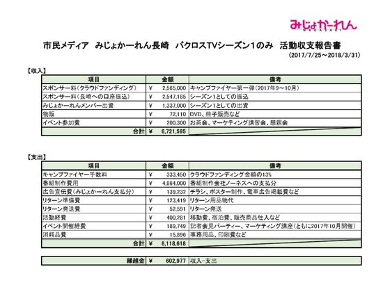 2018/04/26 17:19いつも応援ありがとうございます(*^_^*)みじょかーれん長崎です! バクロスTVシーズン1の収支報告ができましたので、こちらでご報告いたします。リターンの発送が長引き、報告が遅くなってしまい申し訳ございません。みなさまにご協力いただいたおかげで、市民メディア全体で制作費を番組制作会社に支払うことができました。本当にありがとうございます! これからも市民メディア、そしてみじょかーれん長崎は進化しながら活動していきます。引き続き温かい応援のほど、よろしくお願いいたします。 市民メディア みじょかーれん長崎 もっと見る