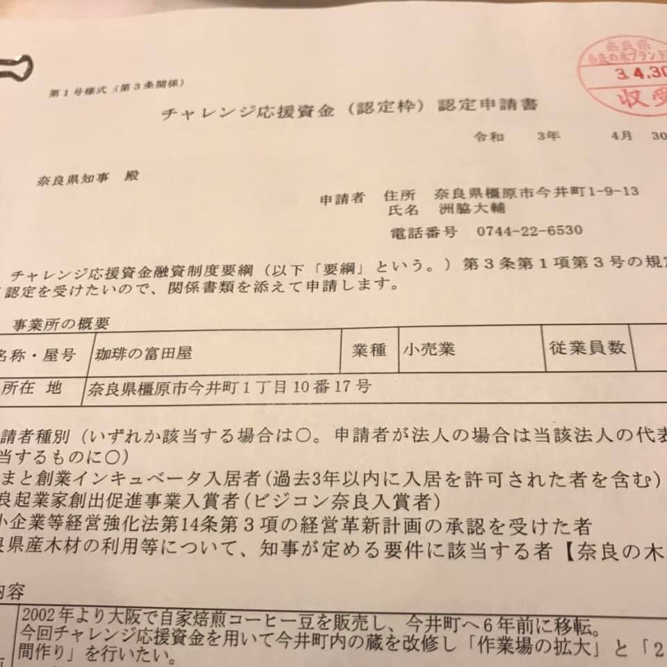 奈良の木ブランド課(県庁)のチャレンジ応援資金融資制度に申し込んでいました。
