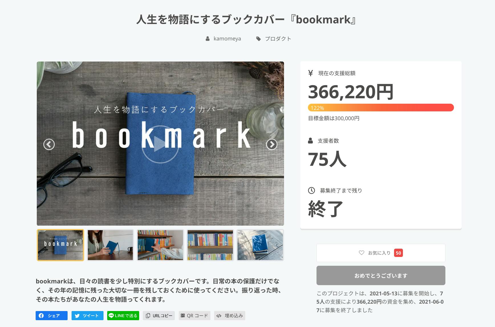 2021/06/10 07:01「人生を物語にするブックカバー『bookmark』」のプロジェクトを運営している、かもめやです。プロジェクトの目標金額を達成しましたので、ご報告させていただきます。現在の支援総額:366,220円支援者数:75※詳細はこちらからご覧いただけます。https://camp-fire.jp/projects/view/413859皆様のご支援、ご協力によりプロジェクトが成功しました。本当にありがとうございます!これから僕たちは、ご支援いただいた資金を使わせていただき、bookmarkの製造に入ります。リターンの発送は7月以降となる予定ですが、発送の際はあらためてお知らせいたします。ぜひ、bookmarkに包む文庫本をイメージしながら、楽しみにお待ちください。改めて、ご支援いただきまして誠にありがとうございます。それでは、引き続きよろしくお願いいたします。 もっと見る