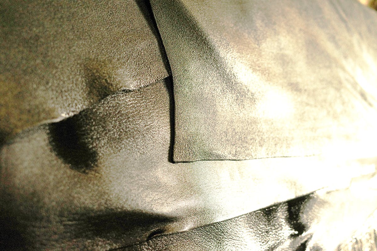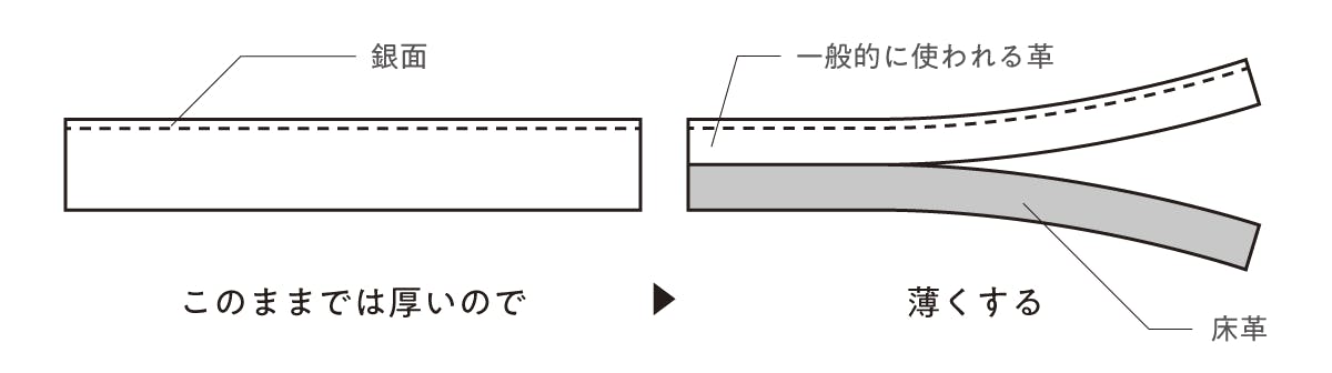 こちらの床革とは、鞣し直後に、銀面を取った後に残った部分、2枚目にあたる部位を指します。銀面とは、一般的に革製品に使われる表皮、革の表面のことです。