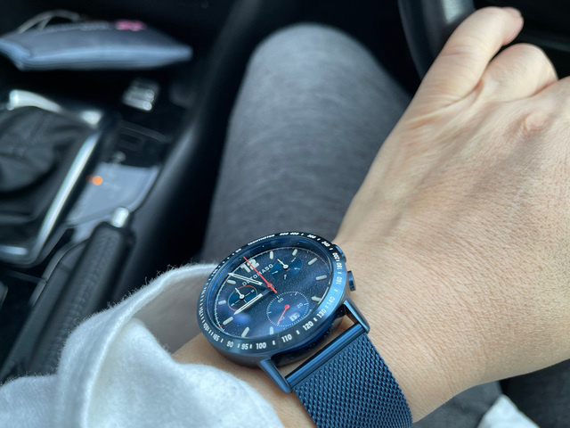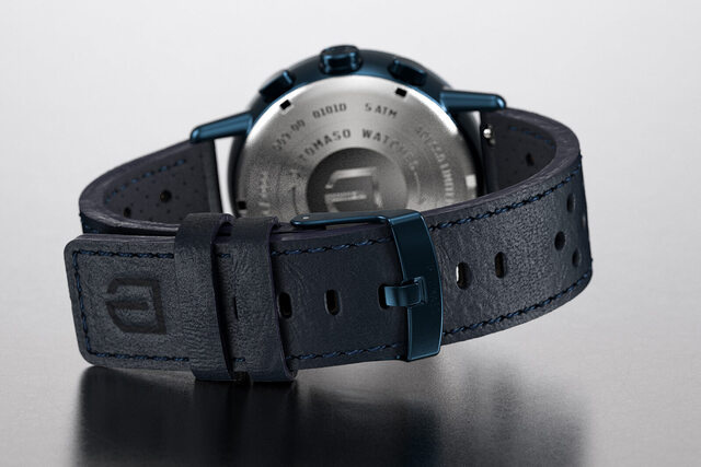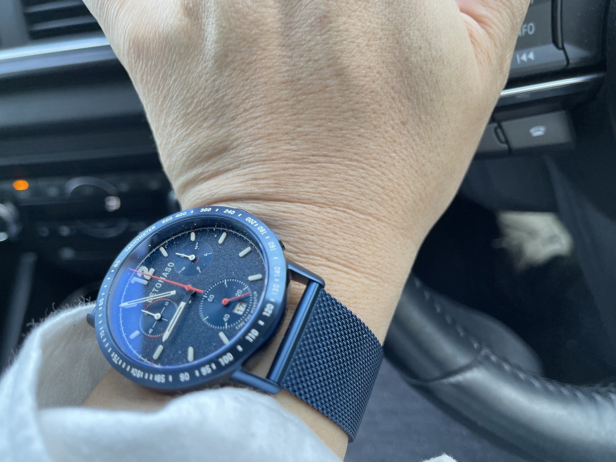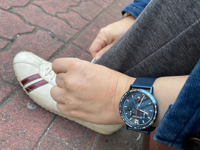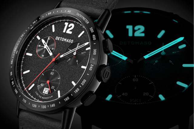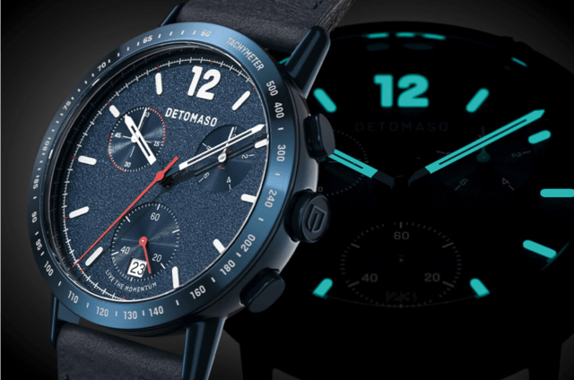 クロノグラフ秒針(中心針)と5分ごとの分目盛りにディープブルーのアクセントを採用する所がDETOMASO。オーソドックスな文字盤でも他のブランドとは異なります。時分針色使いがオリジナルで上質です。針中央がヌキのデザインではなく中心部分が蓄光になっています。
