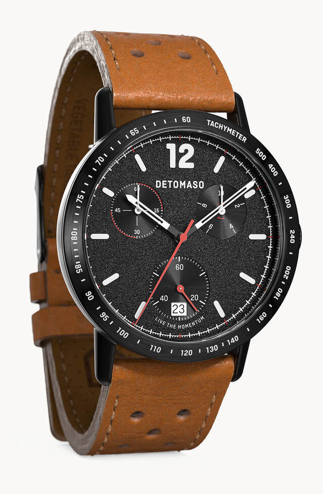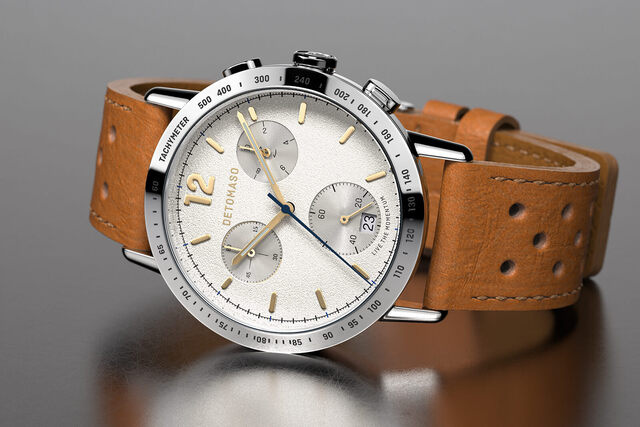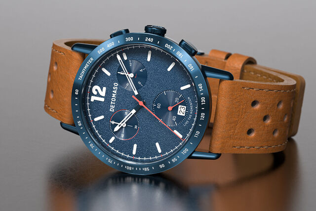 イタリアンレザーストラップ、ガラス職人、エッセンスを再現するための地元デザイナーを求めて、イタリアのさまざまな地域を調査しました。イタリアのアリティジャーノの作り出した魅力的な素材をドイツのマイスターが組み立てた時計。DETOMASOは再び、勢い(弾み)と供に急速に動きマークとリチャードだし、再び歩みはじめたのです。