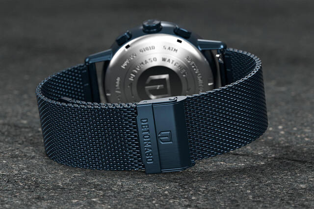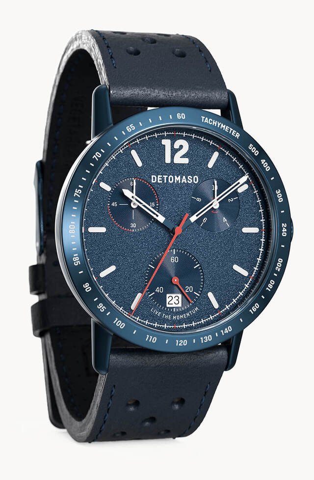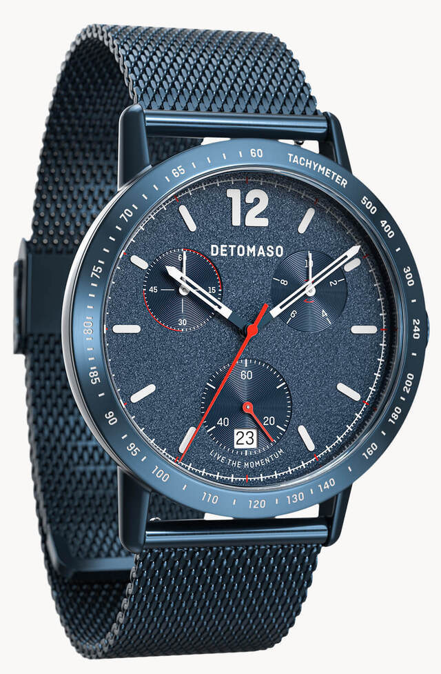 イタリアの海を彷彿させる綺麗なブルーはケースと文字盤に施されています。DETOMASOでは全てのコレクションにブルー色は欠かせません。前回のSorpassoコレクションではリミテッドブルーが世界的な人気でいち早く限定数を完売してしまいました。今回のファーストモデルもレミテッドエディション限定数限りになります。お早めにご支援ください。日付カレンダー付きクロノグラフ。一番イタリアを感じる色合いです。