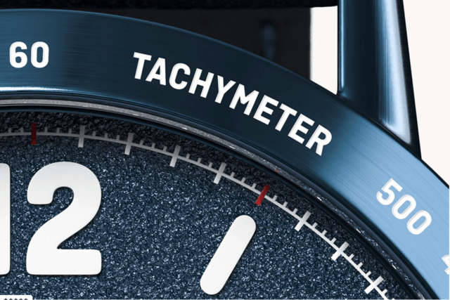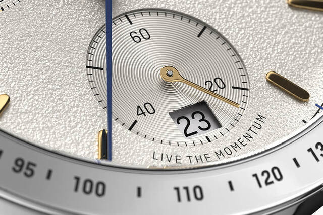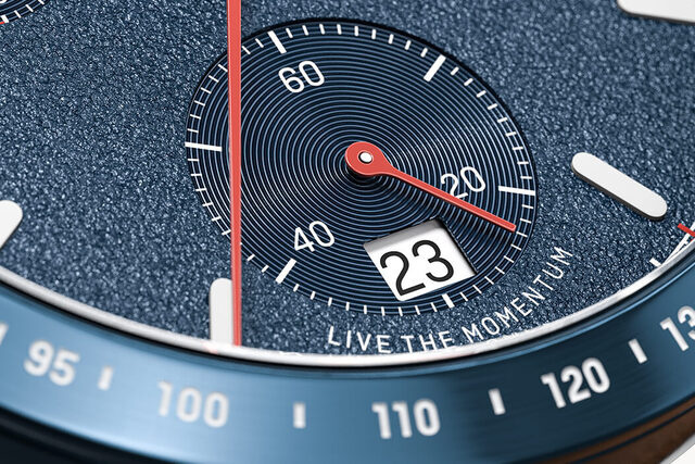 光沢のあるIPブルースステンレスケースに比べると、荒い砂地のブルー文字盤は色がより深い青になります。ヌキによる針とインデックスの白が爽やかな印象を与え好感度が高いモデル。秒針(6時位置スモセコ)やクロノグラフ秒針(中心針)、5分ごとの分インデックスに赤のアクセントが全体をまとめています。また時針・分針は蓄光針になっております。