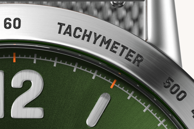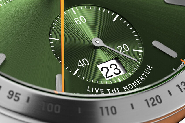光によって豊かな表情を出すグリーン文字盤にケースに合わせたシルバーのインデックス。シンプルなマットシルバー針は上記2モデルと異なり、針中央がヌキのデザインではなく中心部分が蓄光になっています。クロノグラフ秒針(中心針)と5分ごとの分インデックスはグリーンによく似合うオレンジ針が施されています。