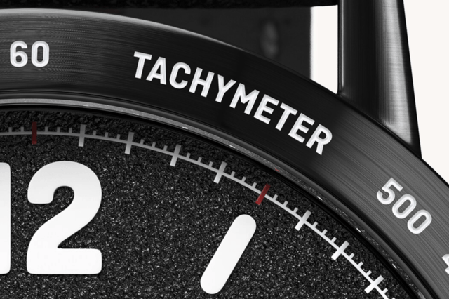 荒い砂地仕上げのブラック文字盤にホワイトのインデックス、ヌキによるシンプルなホワイト針は蓄光針になっています。秒針(6時位置スモセコ)やクロノグラフ秒針(中心針)、5分ごとの分インデックスに赤のアクセントが全体を引き締めています。