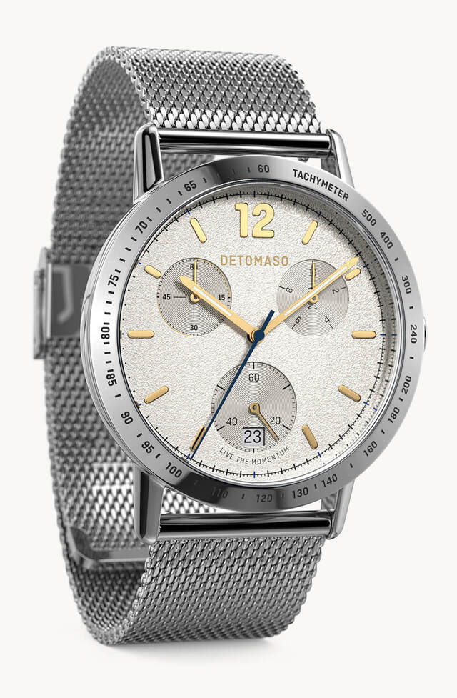 ゴールドインデックスと荒い砂地の白は上品さと高級感を備えています。DETOMASO ADESSOモデル唯一DETOMASOロゴが白ではなく金色です。ステンレスケースには鏡面IPシルバーが施されています。ブラック同様、凡庸性が高いのですが、他の色と違い知的なイメージがするモデルです。日付カレンダー付き。