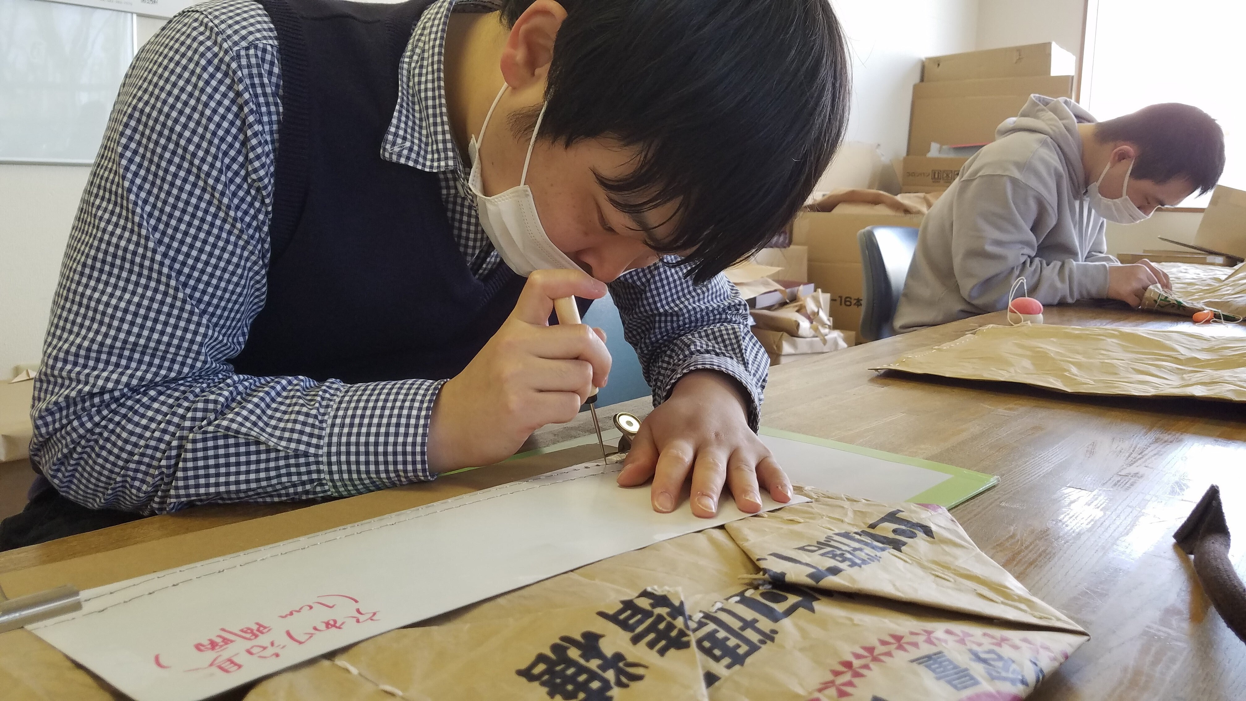 つむぐと『リメイクバッグ』は元々の食品袋が持つデザインの多様さを活かしたアップサイクル商品ですが、今回のクラウドファンディングでは、ご利用者が手縫いで縫製したバッグと身体に麻痺があるご利用者が描いたアートを組み合わせた商品をご用意しています。