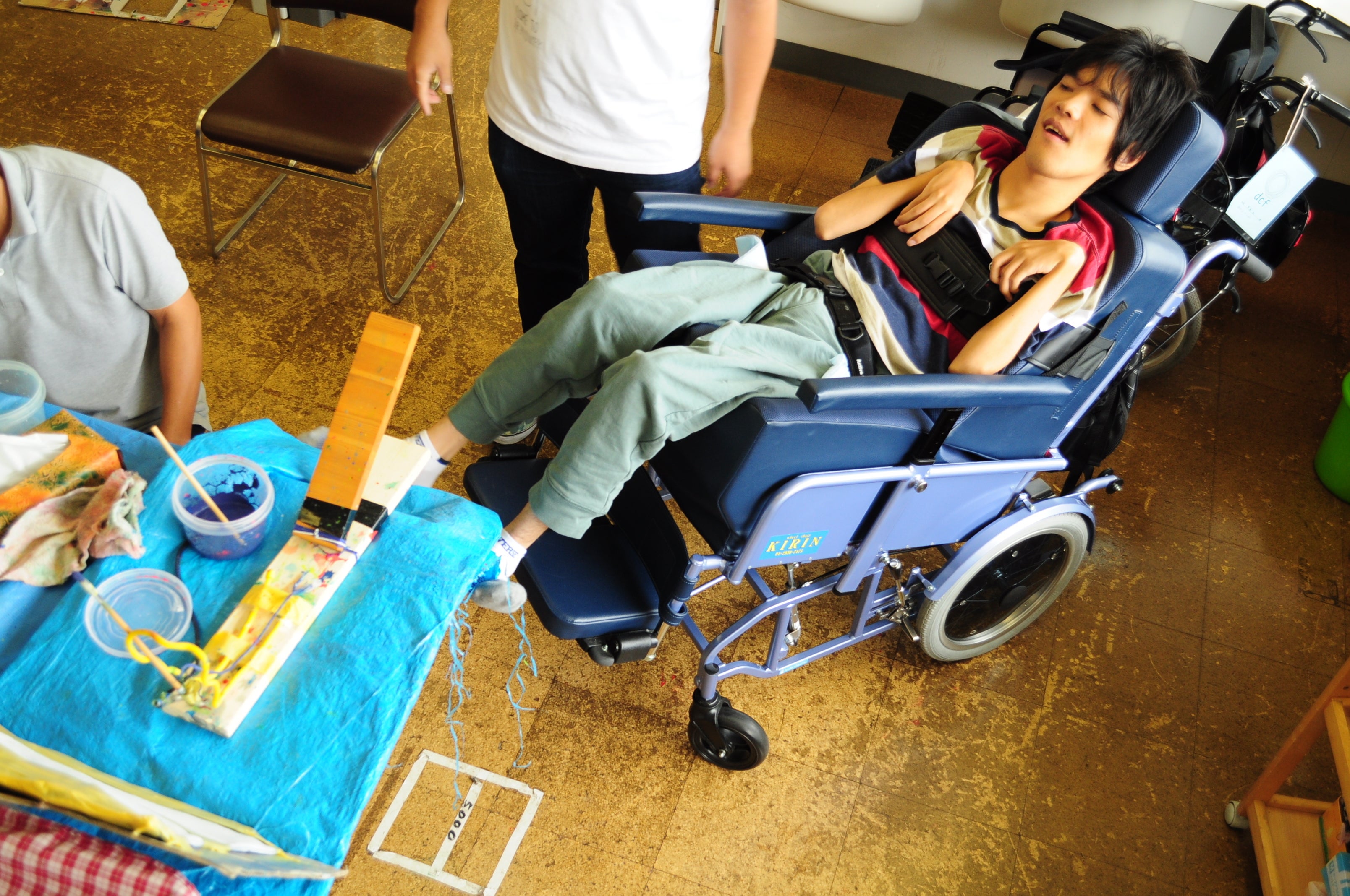 こんな仕組みになっています。①の木の部分を押す→②紐を固定しているクリップが開き、筆がバネの力で矢印のようにビュッとはねる→③の棒に筆がぶつかり、絵具が色を付けたいものに飛び散る(どこに飛び散るかわからないのが玉に瑕)。押すという動作に着目した「創作ツール」です。その名も「振る造くん(ふるぞうくん)」!!トップの写真の方は脚がよく動くので、脚で操作してくれます。うまいこといくとこんなに綺麗にできます。でも、できないときもあります・・・。 え?よくわからない?そんな方のために、この活動報告で様々な動画をお見せしたいと思います。お楽しみに!