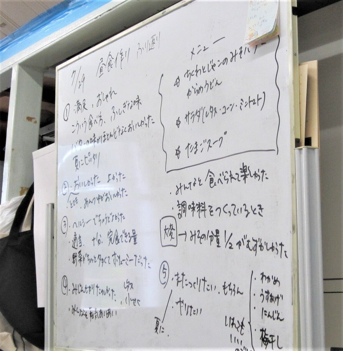 食後は必ず振り返りをします。ご利用者からは「みんなと一緒に調理ができて楽しい」、「また作りたい」、「簡単だったよね」などなど素晴らしい意見が飛び交っています。