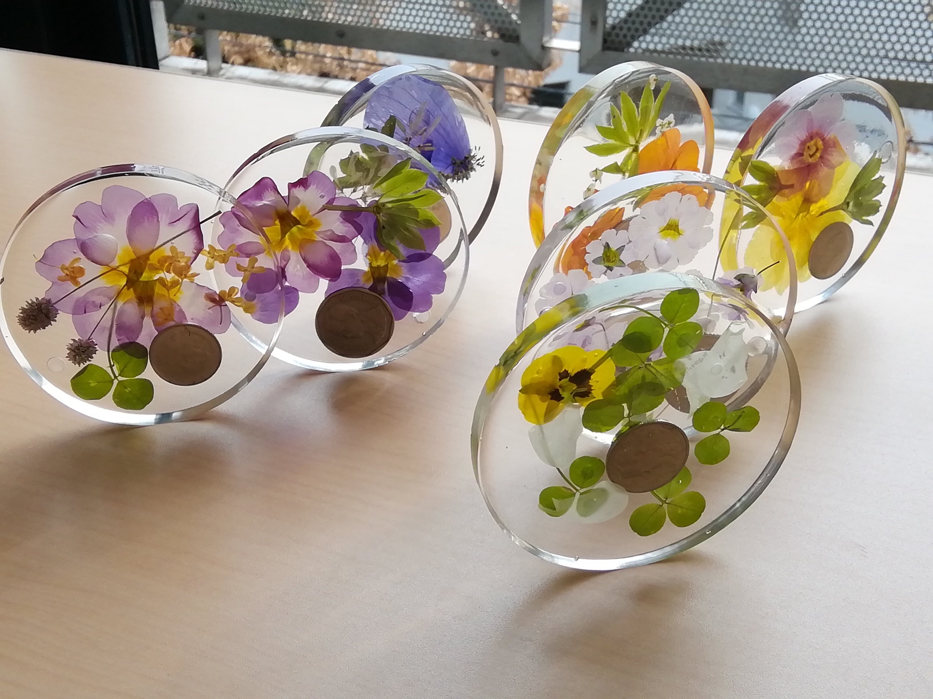 主に知的障害のある方が通う事業所です。生活介護という種別に分類されます。企業からの受注作業や公園清掃などを中心に取り組んでいますが、創作活動に特化したグループもあります。そこで作られたのが、「押し花コースター」です。花を育て、押し花にして、その花を丁寧にピンセットでレイアウトするなど、細かい作業でもしっかりと作り上げることができます。