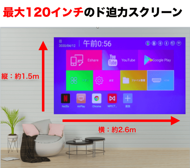 120インチのテレビなんて何十万円もしますが、Homey Proは超低価格で全てのわがままを叶えてくれます。