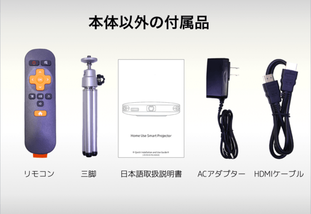 A:製品本体 / 充電アダプタ / リモコン/ 三脚/日本語説明書/HDMIケーブルを予定してます。