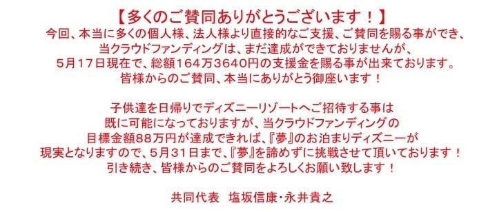 2022/08/15 02:32こんにちは。湘南ドリームプロジェクトです。皆様に順次公開をさせて頂いておりました、今回の活動報告ですが、昨日、全ての報告が完了し、今回の活動報告が完結致しましたので、ご支援頂きました皆様に、ご報告させて頂きますね。是非、ご覧頂けると嬉しいです!湘南ドリームプロジェクト2021活動報告 もっと見る【TDLご招待のご報告 その2】1泊2日で東京ディズニーリゾートへ行って来ました!