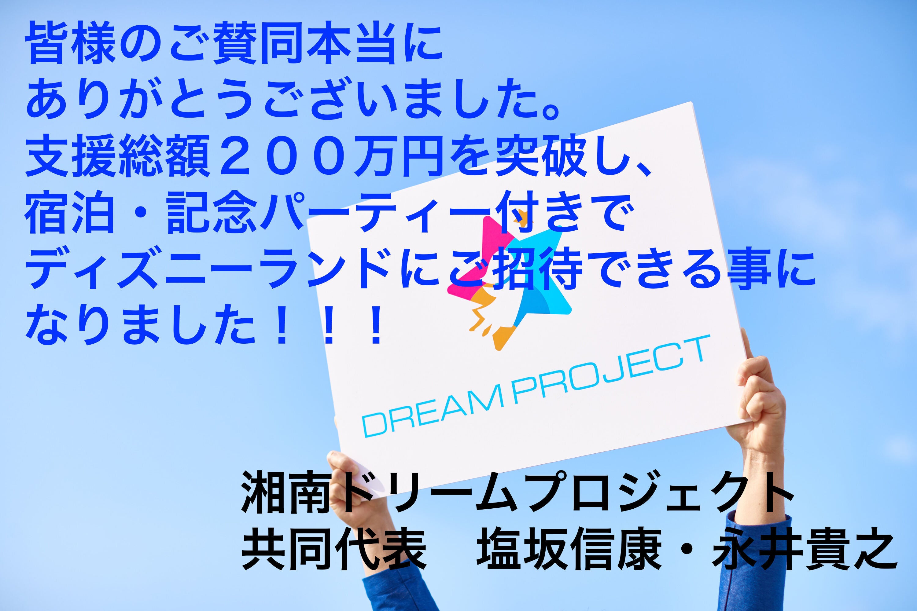 既に、ご支援者の皆さまには御報告させて頂いておりますが、本日、下記のメッセージをリリースさせて頂きました。皆様のご支援、誠にありがとうございました!!!プロジェクト完了まで、引き続きどうぞよろしくお願いいたします。《本文》ご賛同者の皆さまへ昨日、5月31日を持ちまして、「湘南ドリームプロジェクト2021」のクラウドファンディングが終了致しました。皆さまのご賛同とご声援、誠にありがとうございました。皆さまからのご声援が私達の糧となり、今回、最後まで走りきる事ができました。既に、数名の方よりクラウドファンディング期間後の支援金の入金方法のお問い合わせを頂いておりますので、今後もご支援は12月のプロジェクト実行日の直前まで続いて行くかと思いますが、本日6月1日現在で、直接支援金とクラウドファンディングでの支援金を合わせまして、総額204万6640円の資金を賜る事が出来ました。プロジェクトを立ち上げた、2021年1月11日には、「もし、宿泊付きでご招待できたら、夢の様だ・・・。」と、発起人2人で、涙を浮かべながら話をしていたのを思い出しますが、皆さまのご賛同のおかげで、あれから5ヶ月経った今、まさに現実にする事ができました。本当にありがとうございます。つきましては、今回ご支援いただきました資金で、下記の「プランC」を「夏休みお楽しみオプション付き」で実行させて頂きたく思っております。(今後、支援金が増額になった場合は、プランDにアップグレードされる可能性もあります。)今月6月28日には、「聖園 子供の家」の児童44名に、このプロジェクトの事を初めて伝えに行く、発表会を行なって参ります。当日は、子供達の人数分、ミッキーとミニーのオフィシャルカチューシャを用意して、当日に持参する様に伝えて参りますね。発表会の様子もまた、皆様に御報告させていただきます。また、今回は、任意団体としての活動であった為、共同代表の2人も本業を持った上での活動でしたので、皆さまとのコミュニケーションが十分に行き届かなかった部分もあったかと思いますが、クラウドファンディングが終了致しましたら、時間的な余裕も出て参りますので、改めて、お一人お一人にご連絡をさせて頂きたく思っております。それでは、皆様へは引き続き、プロジェクト完了まで、随時御報告をさせて頂きますので、どうぞよろしくお願いいたします!この度のご賛同、本当にありがとうございました!湘南ドリームプロジェクト共同代表 永井貴之・塩坂信康※プランC【前泊付きディズニーランド幕張ホテル記念夕食プラン】予算約176万円児童全員を前日宿泊付きでディズニーランドへご招待し、宿泊時に記念立食パーティーを行うプラン。※夏休みお楽しみオプション 予算約11万円当プロジェクトは、当初2021年の夏休み期間の実施を予定していましたが、コロナ禍の影響により、12月の実施になってしまった為、夏休みにも何か楽しみを提供してあげたいと考えた末、新・江ノ島水族館の年間パスポートをプレゼントし、いつでも水族館を楽しめる夏休みにしてあげる事に致しました。
