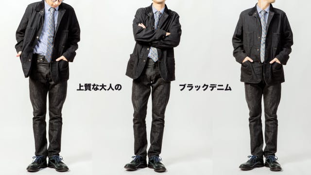 テーラードジャケットにブラックデニムパンツを合わせるときれい目なビジカジスタイルとして活用できます。