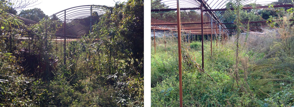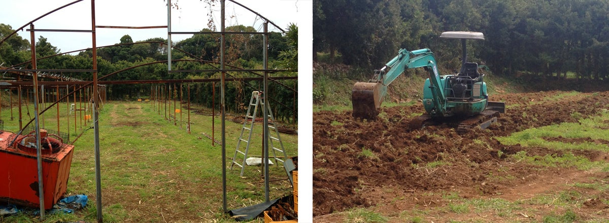 畑を借りた当初、朽ちたハウスや雑木、太いツタ、竹が生い茂り、整備に困難を極めましたが、少しづつ草刈りしては焼却を繰り返し、古いハウスは撤去し、重機を入れて天地かえし(土の上下を入れ替え)をしました。