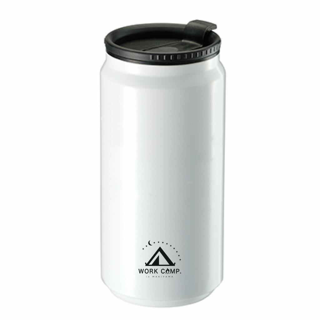 「ワークキャンプ」オリジナルデザインが印刷された 、缶ジュース形のユニークなステンレスタンブラー。保温機能付き。