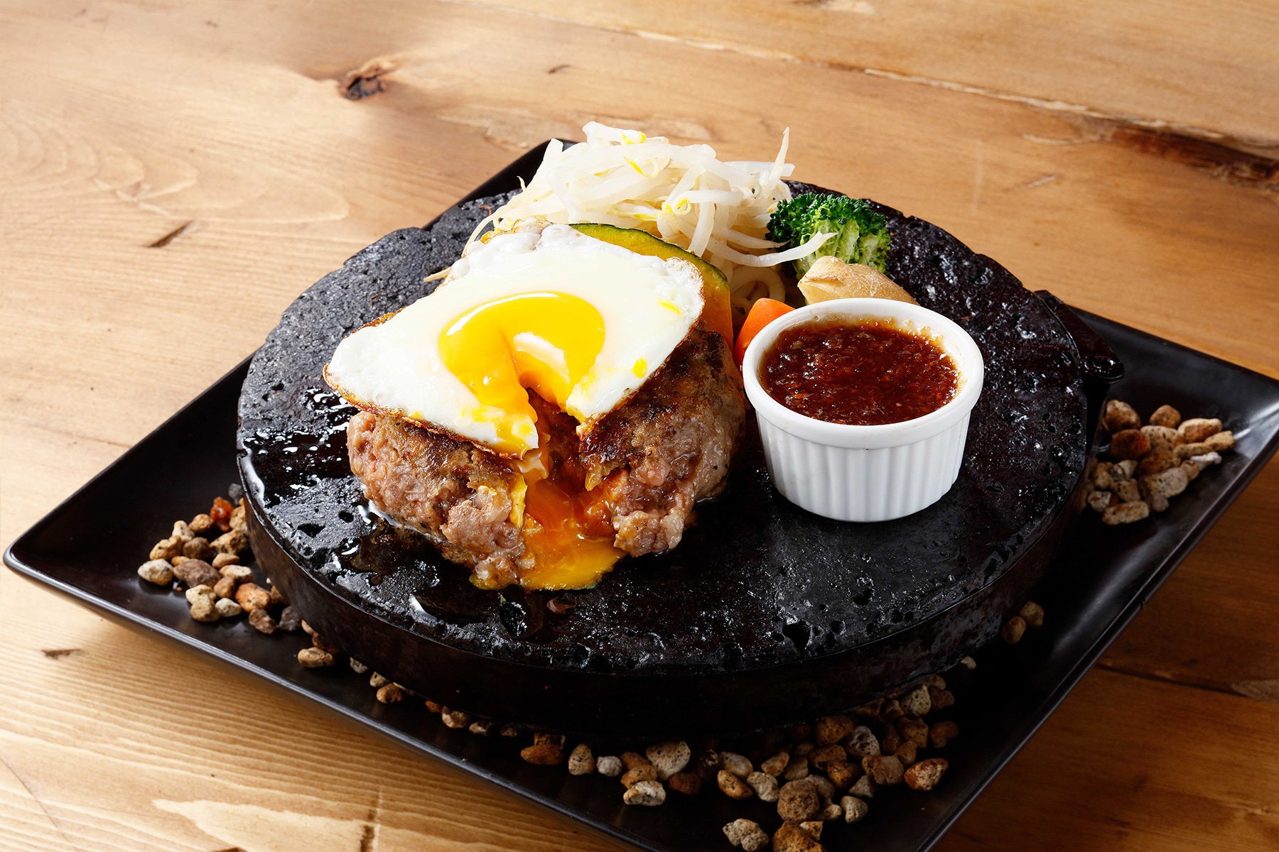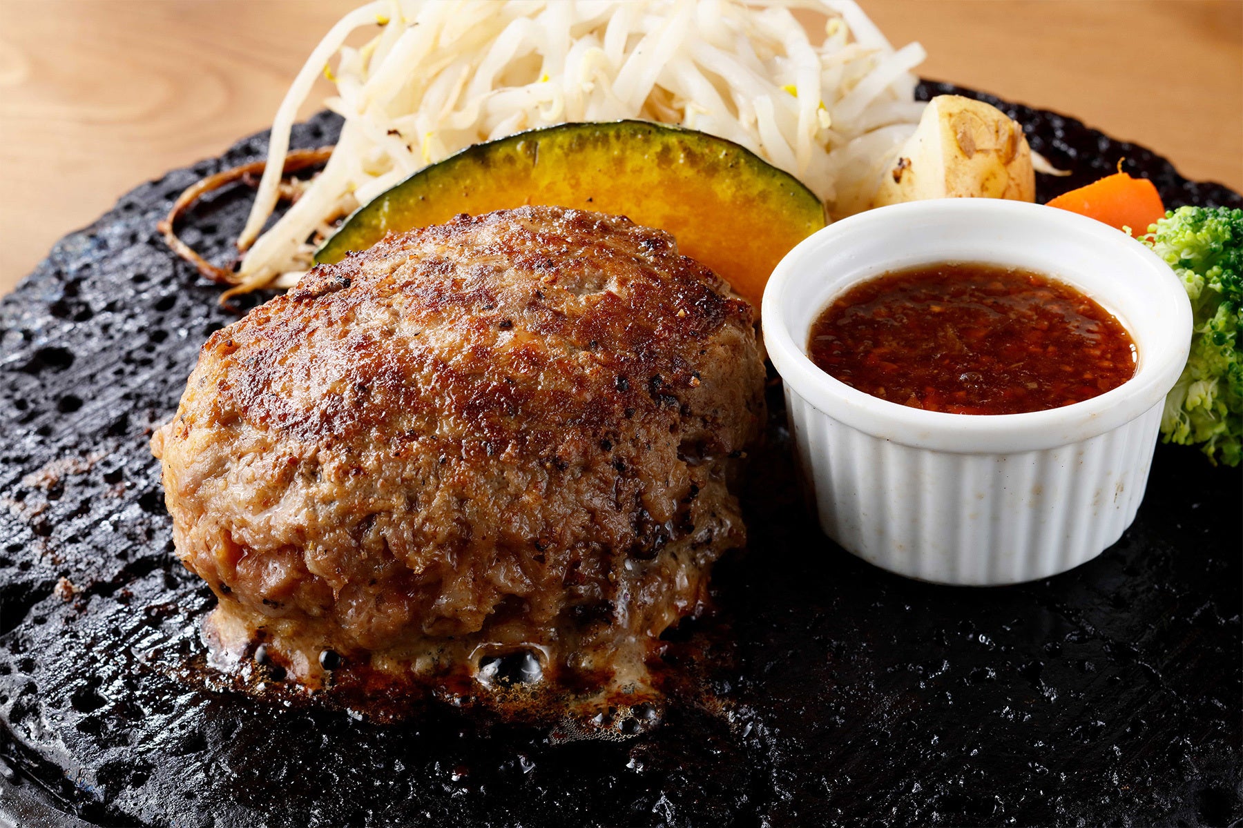 熱々の溶岩石プレートの上で絶妙なレア加減に焼き上げられたハンバーグは、じわっとジューシー。