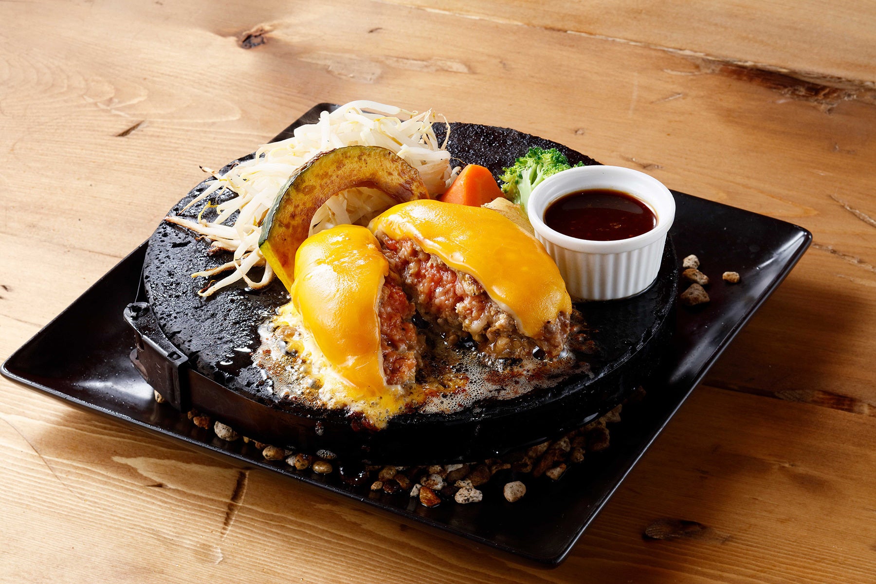 焼き加減は、絶妙なレアに。好みに合わせて、溶岩プレートで火を通していただくスタイルなので、最後の一口まで、熱々でジューシーなハンバーグをお楽しみいただけます。