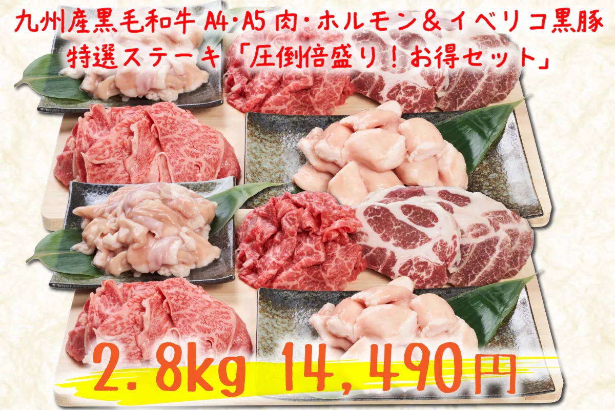 3.【A4・A5黒毛和牛切り落とし&ホルモン&イベリコ黒豚ステーキセット2.8㎏】