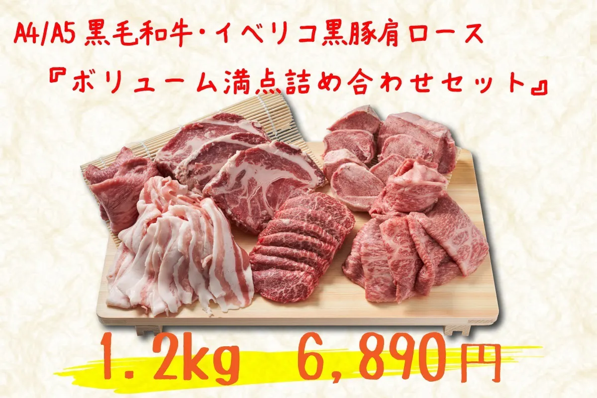 1.【数量限定・黒毛和牛A5ランク&イベリコ黒豚盛り合わせ1.2㎏】