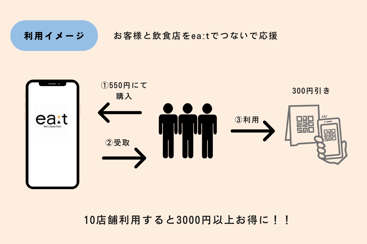 ~リターンは「eaːt」ご提供~飲食店でご利用いただけるお得な電子クーポン「eaːt」は1枚につき300円以上の割引でお食事ができるクーポン10枚を1セット550円で販売します。全て使えば3,000円以上お得に!さらに、電子クーポンなので、非接触で安心です。各利用可能店舗へQRコードを設置しておりますので、QRコードを読み込むと割引ができます。