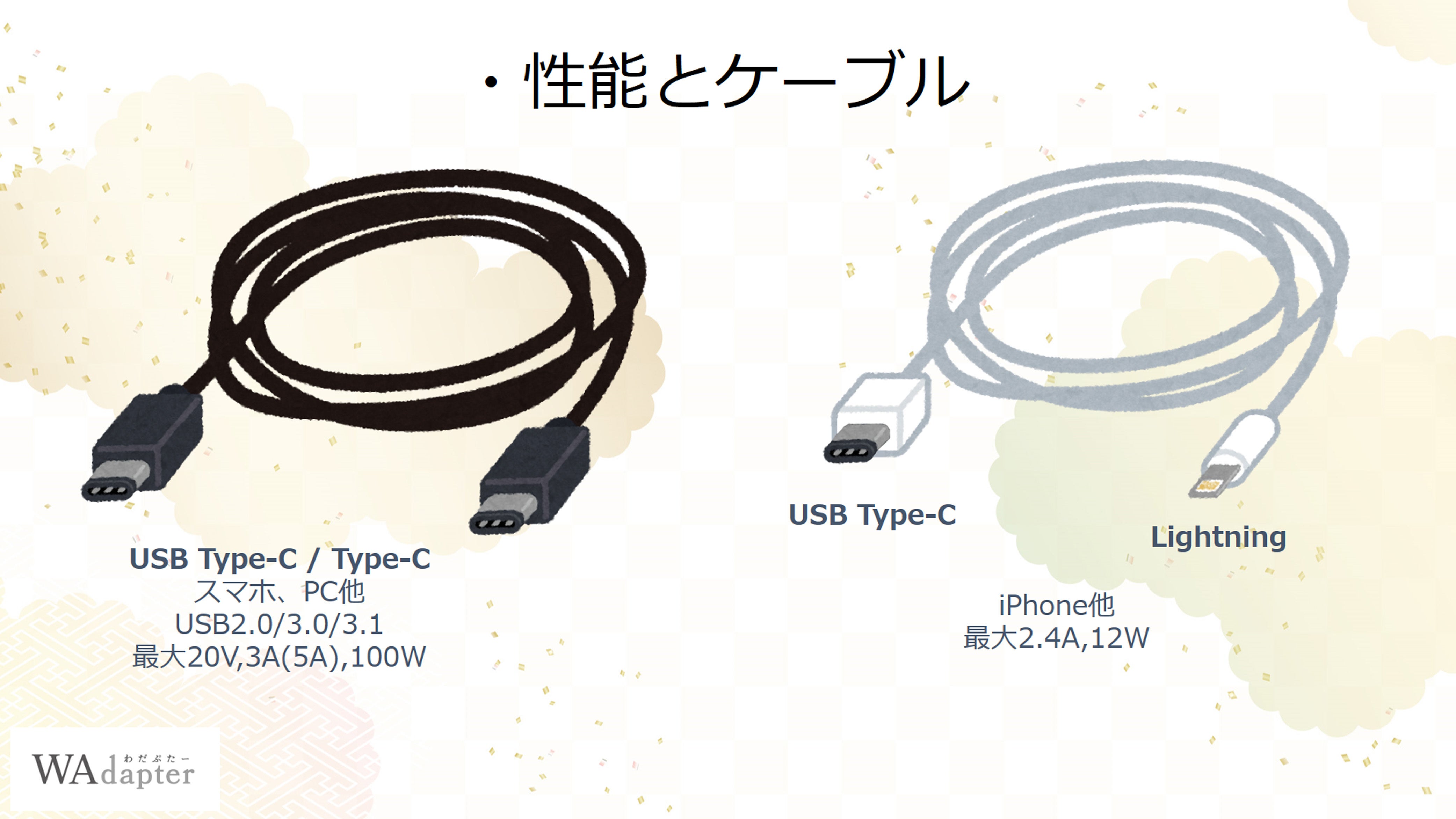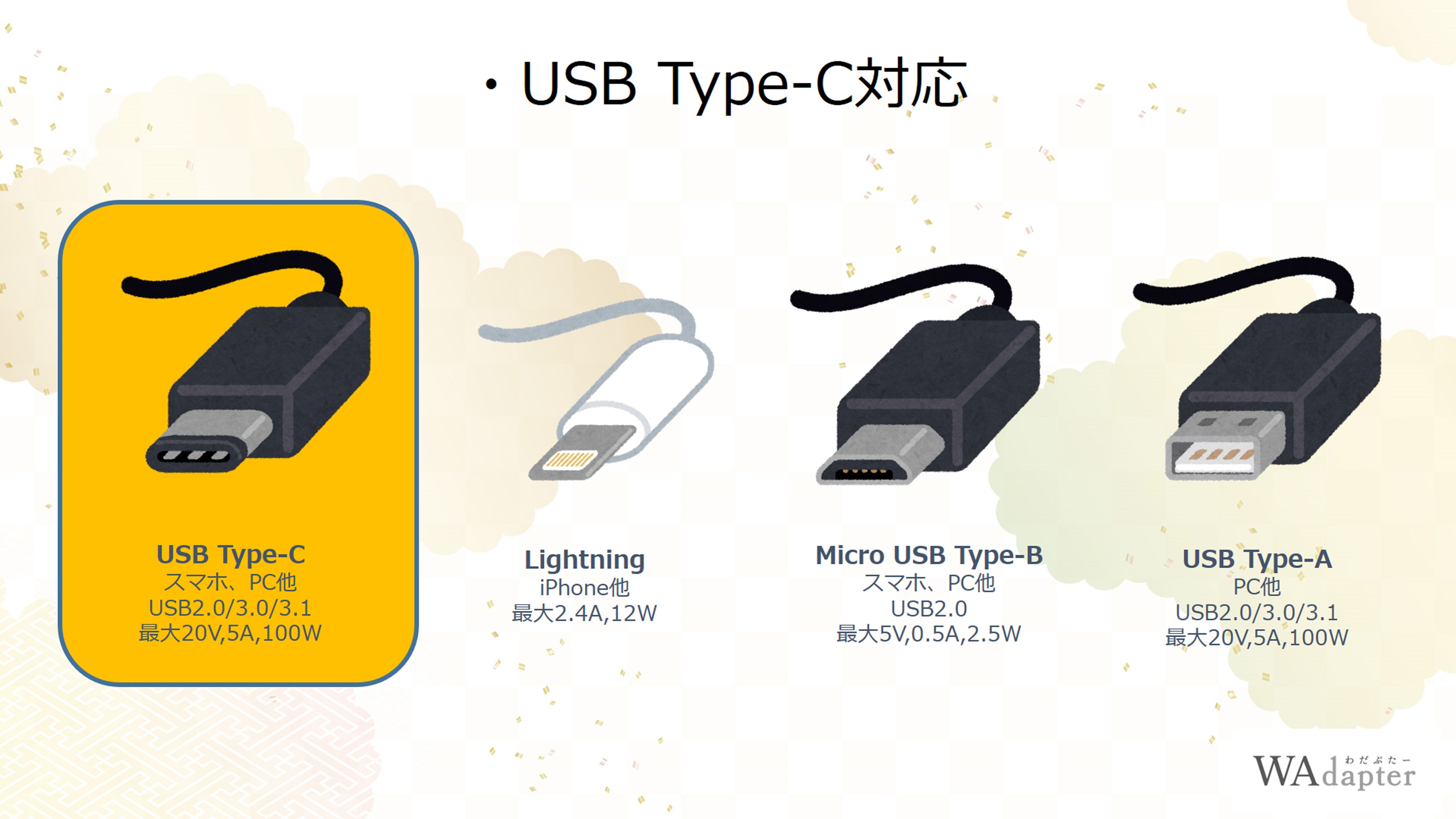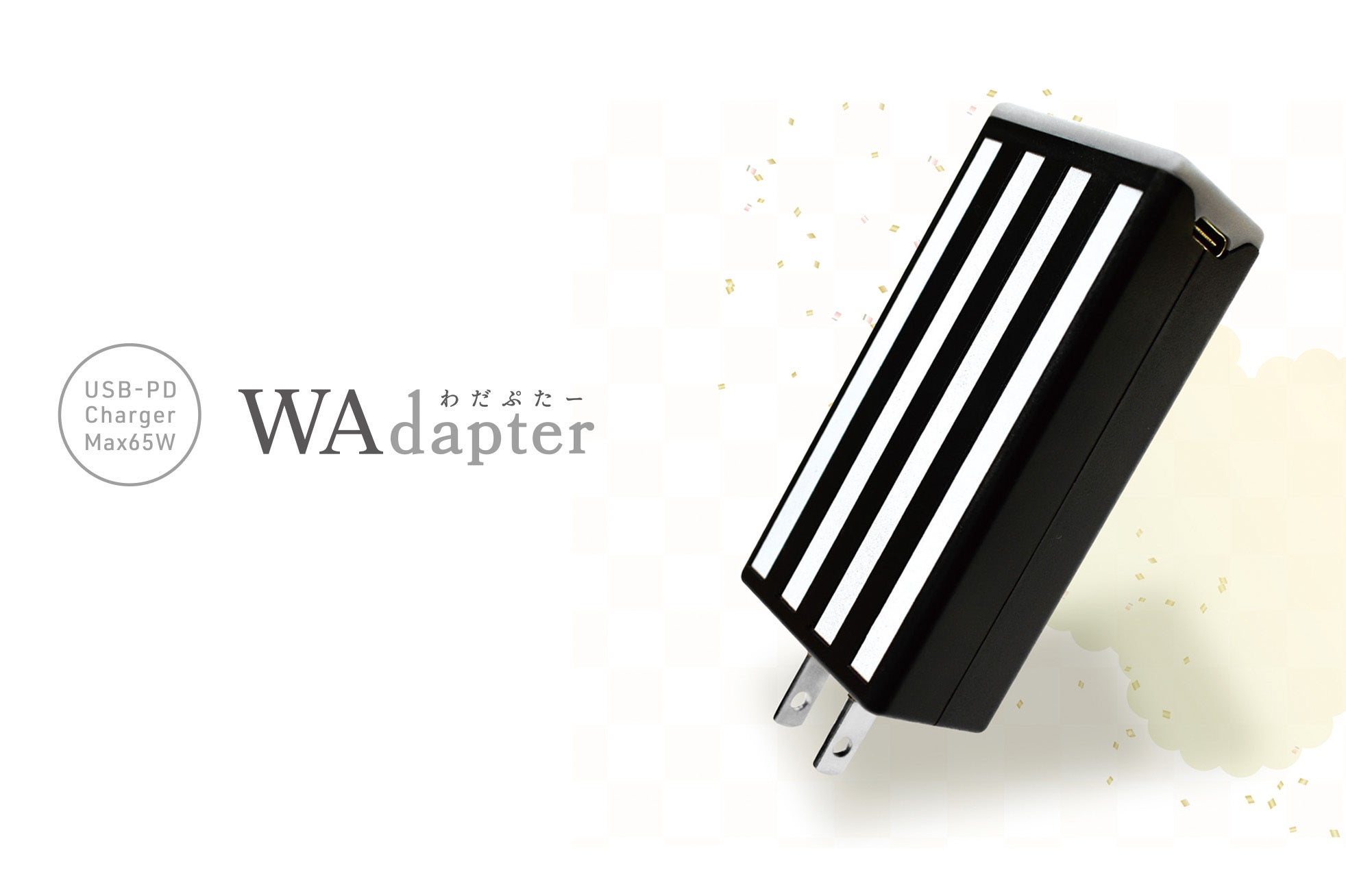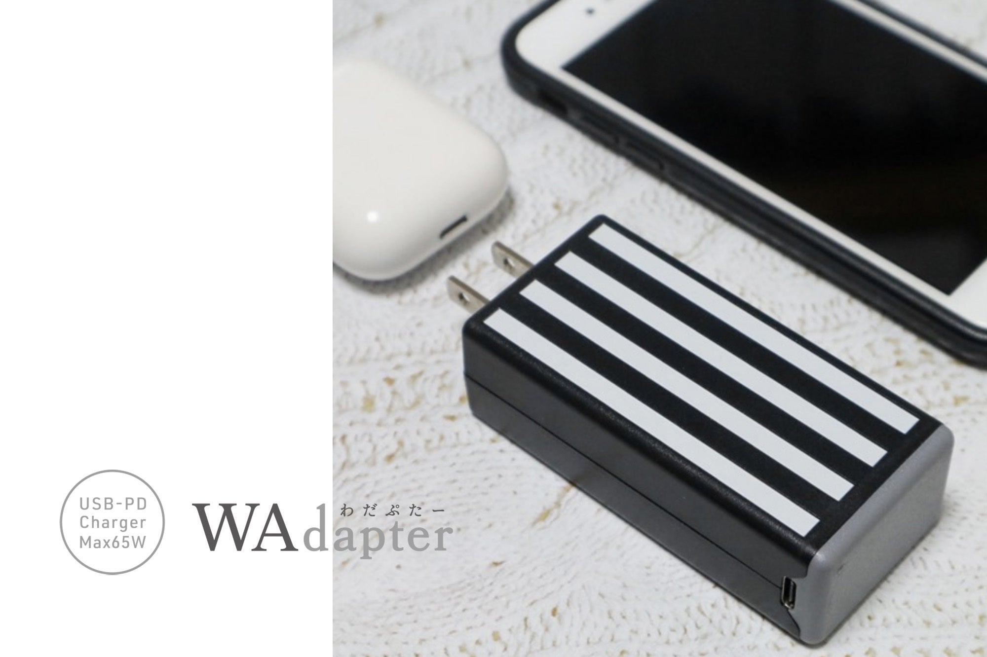 WAdapter(わだぷたー)は、USB Type-C(最大出力65W)かつ、USB PD(PowerDelivery)対応。