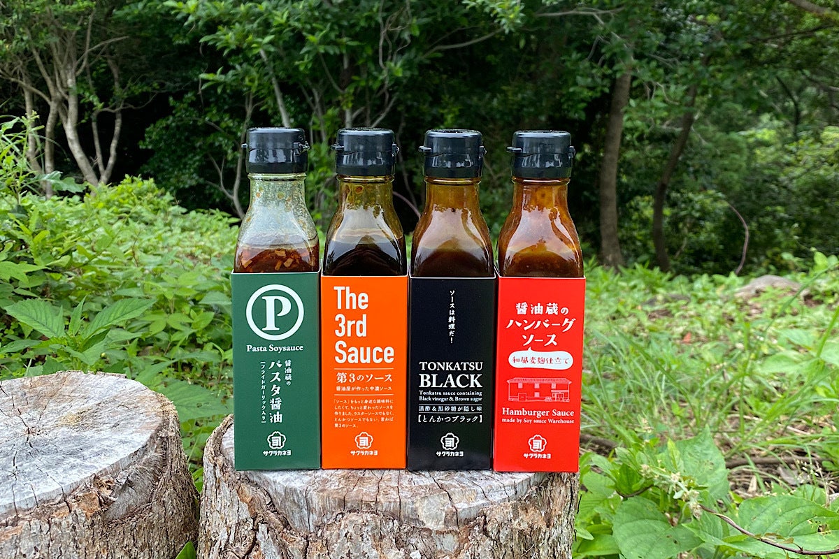弊社のソース4本セットです。弊社の醤油をベースにつくったソースです。