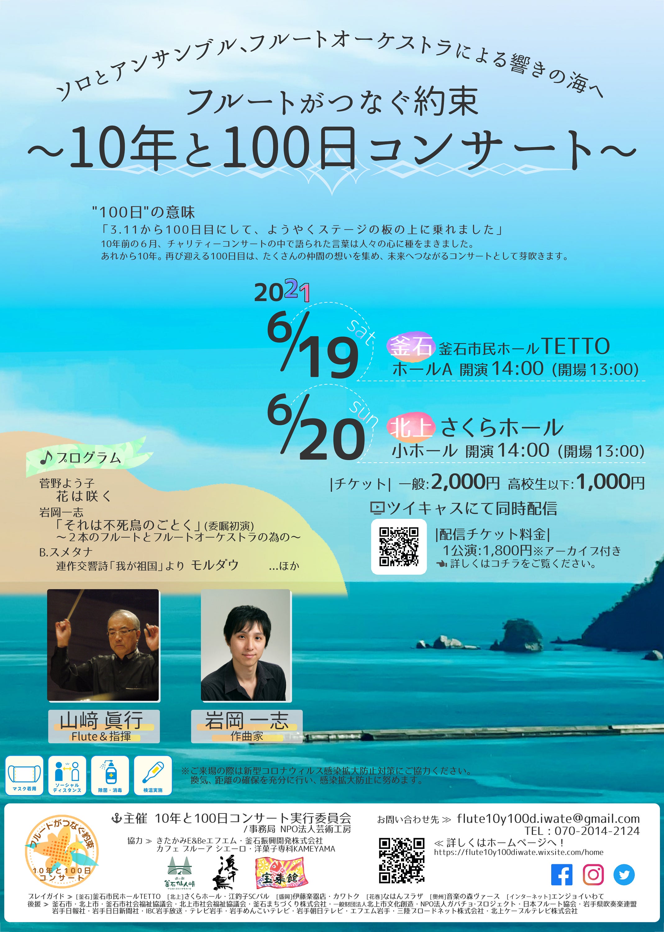 2021/06/20 08:00こんにちは!10年と100日コンサート実行委員会クラウドファンディング担当です。昨日釜石公演が無事に終了いたしました。本日は北上公演です!コンサート前日も(現在も?)バタバタとしており、色々なお知らせが遅れてしまい申し訳ございません。当日の様子は後ほどあらためて報告させていただきます。本日はサポート奏者の皆様と、ピアノ伴奏の先生をご紹介いたします。 東京からのサポート奏者の皆様は、全員PCR検査を受け 陰性であることを確認してからお越しいただいております。中野 重孝(なかの しげたか)1946年福島県生まれ。大学中退後、東京交響楽団ステマネ。74年よりムラマツで修理調整担当。2015年退職。現在「フルートアトリエ中野」主宰。山田 くに子(やまだ くにこ)東京都出身、在住。洗足学園音楽大学卒業。洗足学園音楽大学講師。山﨑先生が繋いでこられたご縁により、今回サポート出演くださいます!こういった人と人のつながりこそ、このコンサートが大切にしている部分を象徴している、と感じます。本番はお二人が奏でる「特殊管」フルートの音色にもご注目ください!※ご事情により、渡部亨氏のご出演が叶わなくなりましたことをご報告し、お詫び申し上げます。菅原 千恵子 (すがわら ちえこ)青森明の星短期大学音楽科ピアノ専攻卒業、同音楽専攻科修了。ニイタカ音楽教室講師。(一社)岩手県ピアノ音楽協会会員。10年前の100日目に開催されたチャリティーコンサートでも、伴奏をご担当されたピアニストです。当時の出演者のお1人である千恵子先生に再び伴奏をしていただき、演奏会が開催出来る事がとても嬉しいです。本日ご紹介した先生方のプロフィール詳細はコチラからさて、本日の北上公演では当日券も数は少ないですが用意しております。”新たな1歩”となる北上公演を現地で楽しみませんか? ご来場が難しい皆様のためには配信チケットもございますので、ぜひ皆様のご都合にあわせてコンサートを楽しんでいただけたらと思います。また、昨日の釜石公演、観たかったな…と思っていらっしゃる方へ!終演後でも配信チケットの購入が可能です。2週間のアーカイブ視聴ができますので詳細はホームページをご確認いただけると幸いです。~10年と100日コンサートについて~ホームページ及び各種SNSはこちら⇒ ホームページ/Facebook/Instagram/Twitter もっと見る