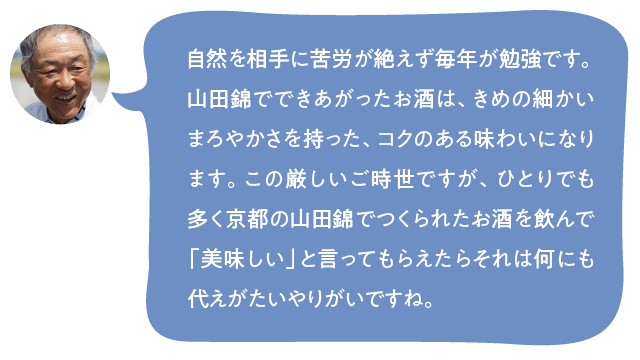 気軽に飲んでもらえることで、熱い志をもった酒米農家やテロワール(土地の個性)を守ることができるのではないか…次の世代へ繋げることも私達の役目だと考えます。京都産山田錦の純米酒を飲んで京都の酒文化を応援してくださる方を募集いたします!