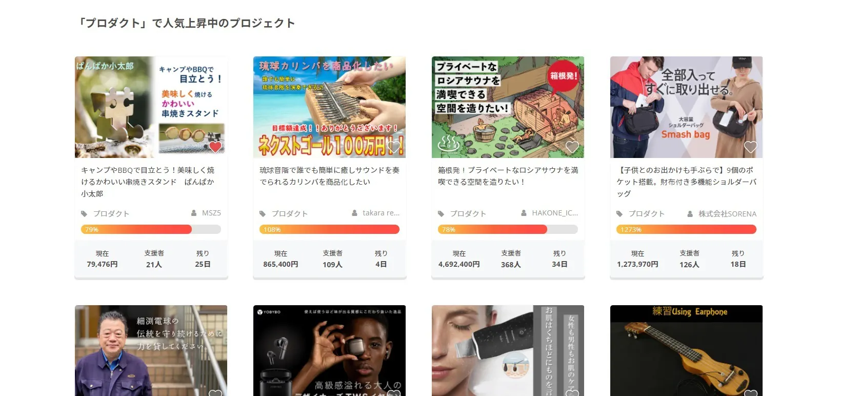 仕事を終えた後にCAMPFIRE内の ”「プロダクト」で人気上昇中のプロジェクト” の一覧を見ていたら↓