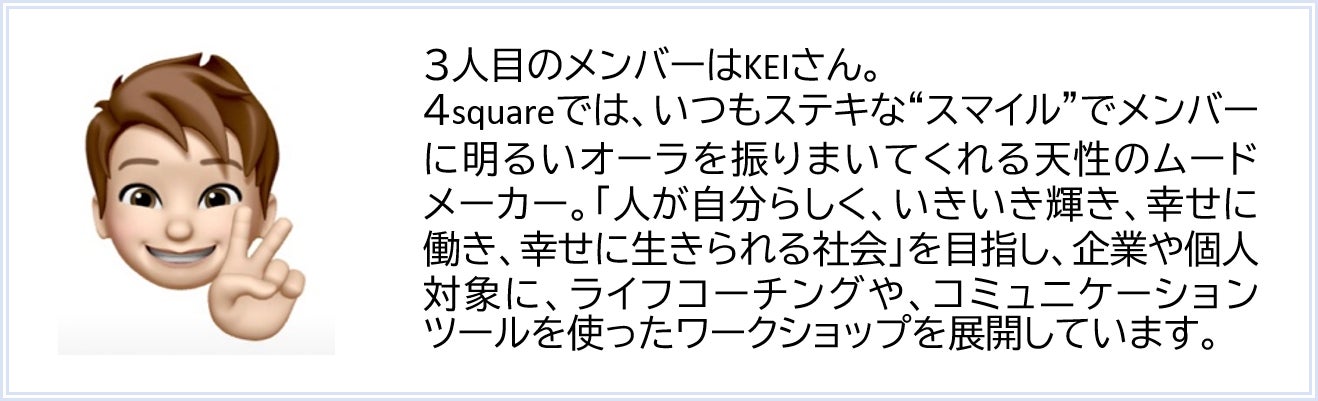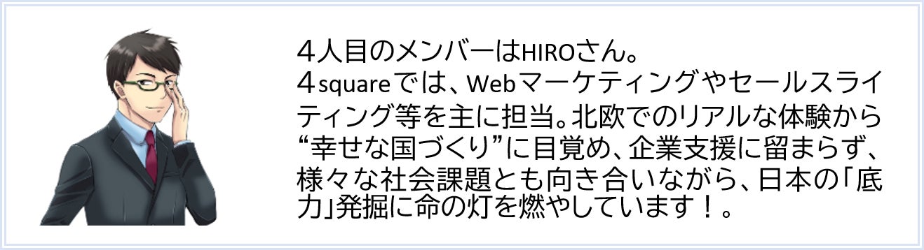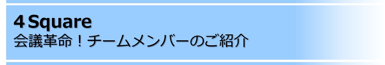 私たちは、経営者も従業員もHAPPYにする "会議革命" を日本全国の企業に起こすべく、2021年1月に立ち上げた「4Square (フォースクエア)」という、4人編制のビジネスチームです。