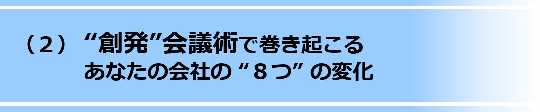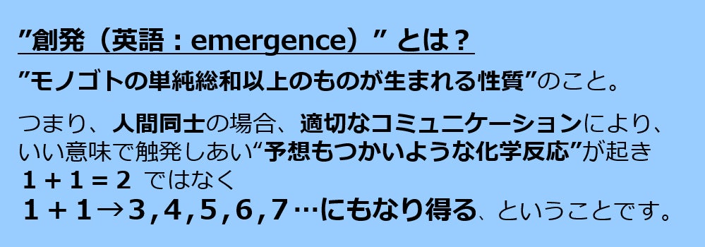 この "創発" 会議をあなたの組織に導入すると、参加者の本気を引き出し、互いに触発し合ってイノベーションがドンドン巻き起こり、みんなの行動力が劇的にアップしていきます。
