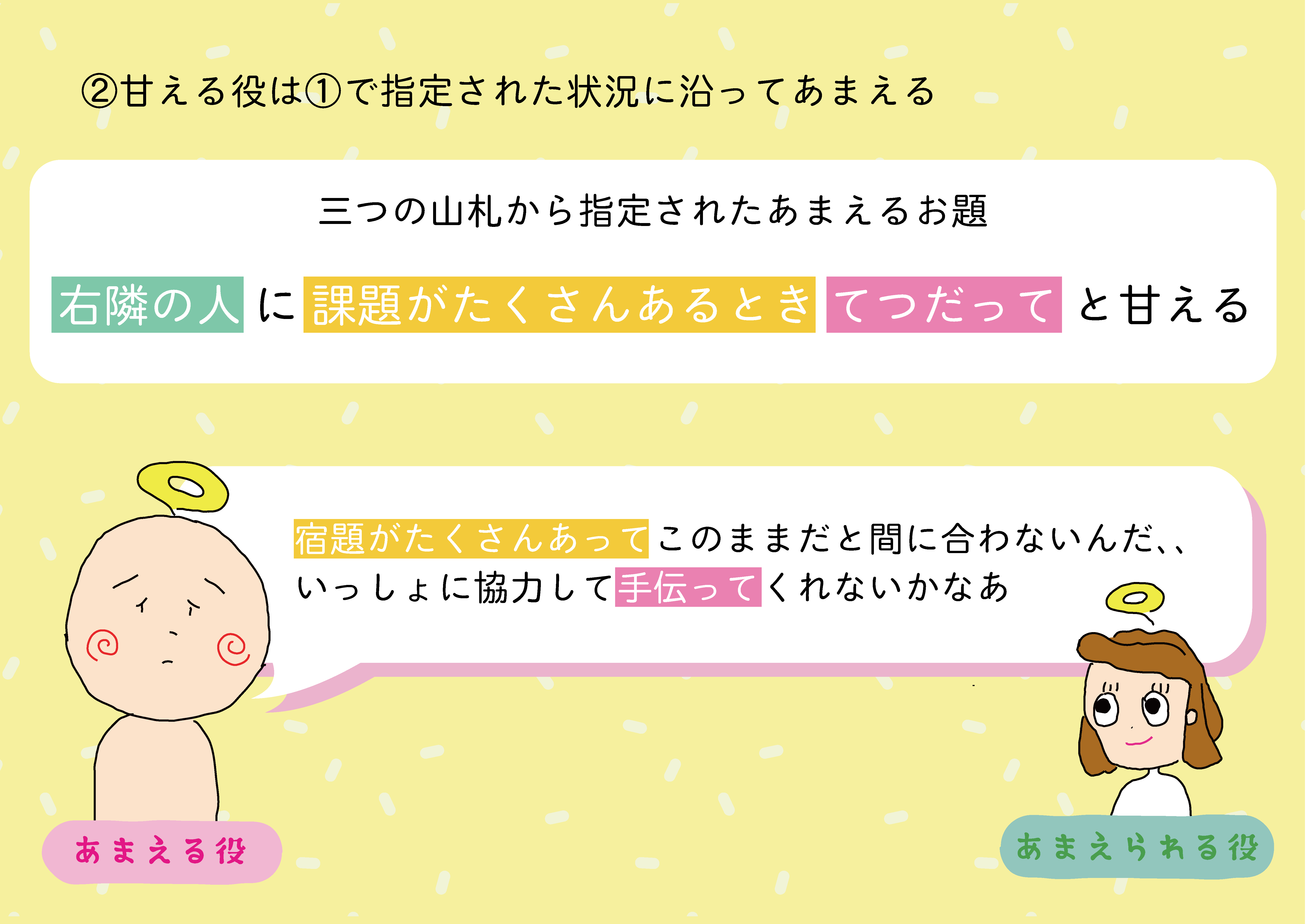どのようにして甘えるかを即興で考え、相手から「いいよ」を引き出せるかが鍵になります。