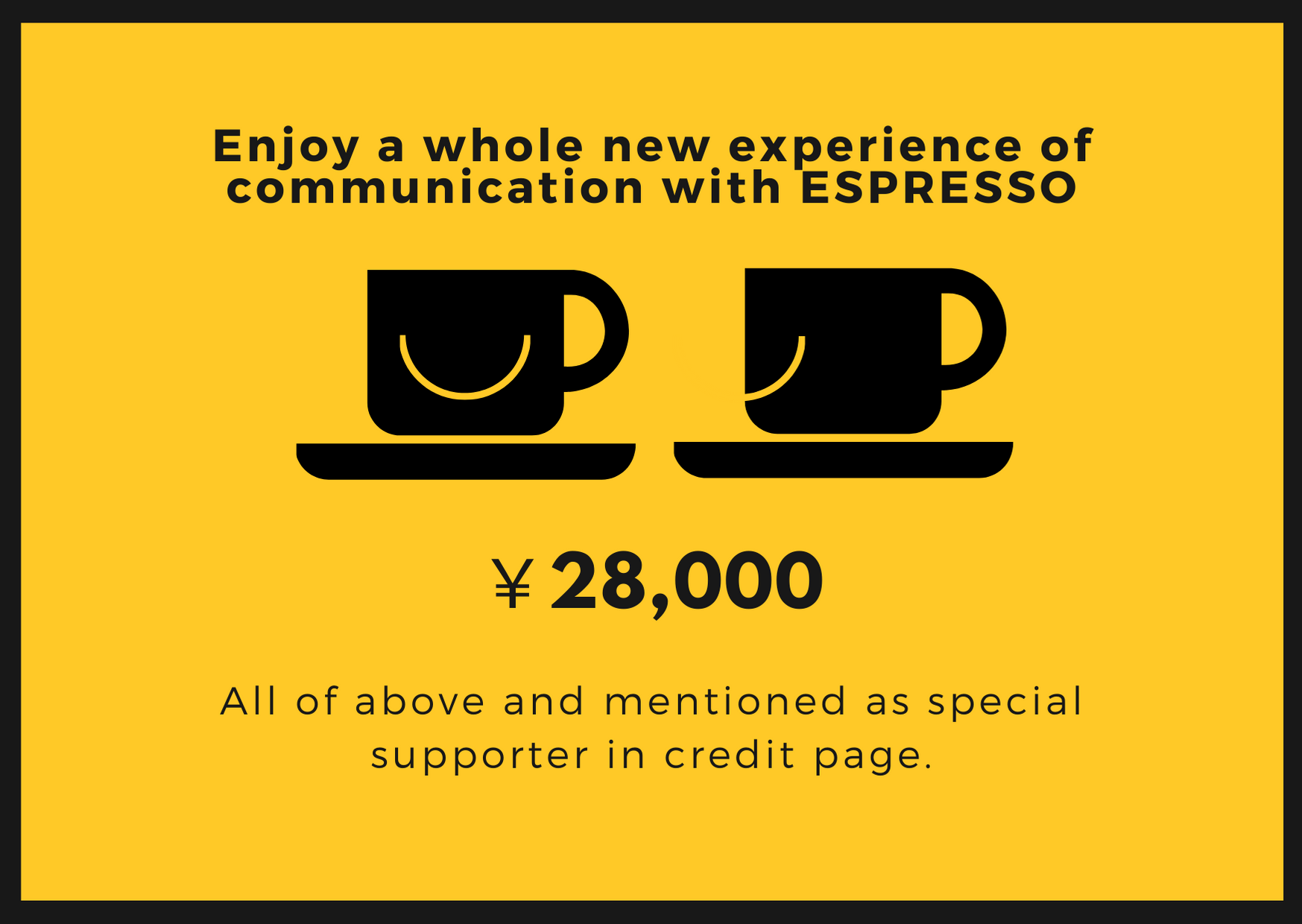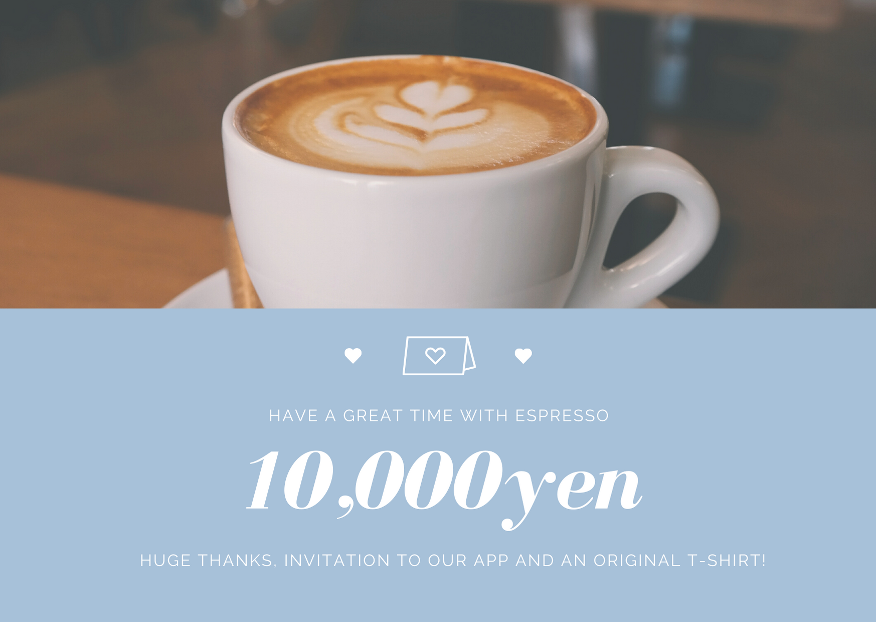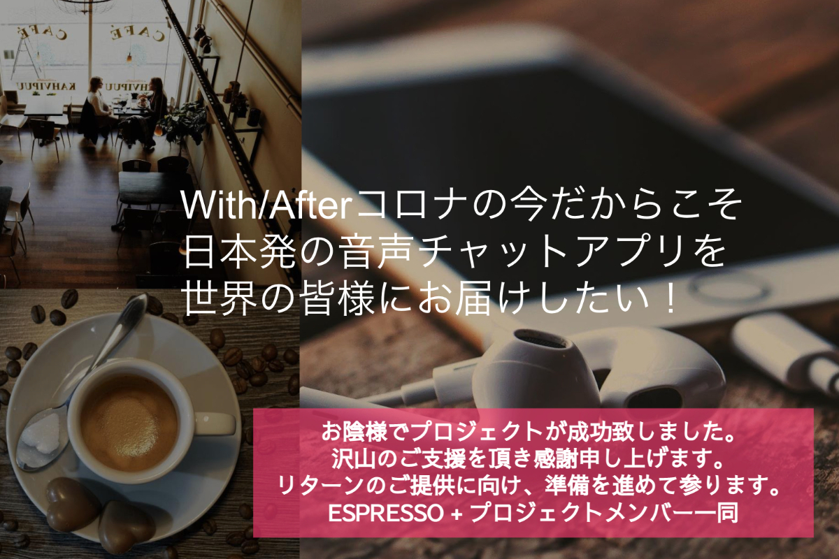 私はアプリにESPRESSO+と名前を付けました。大切な人とエスプレッソコーヒーを飲んでいる時のように、アプリを通じたリアルなコミュニケーションによって、皆さま一人ひとりの人生を豊かにしてほしいという、思いを込めています。どうか一緒に、日本発の音声チャットアプリを開発するため、お力を貸してください。