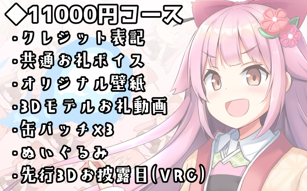 クレジット表記、オリジナル壁紙、お礼ボイス(共通)、3Dモデルお礼動画、缶バッチ(同種×3)、ぬいぐるみ、お披露目(VRC)