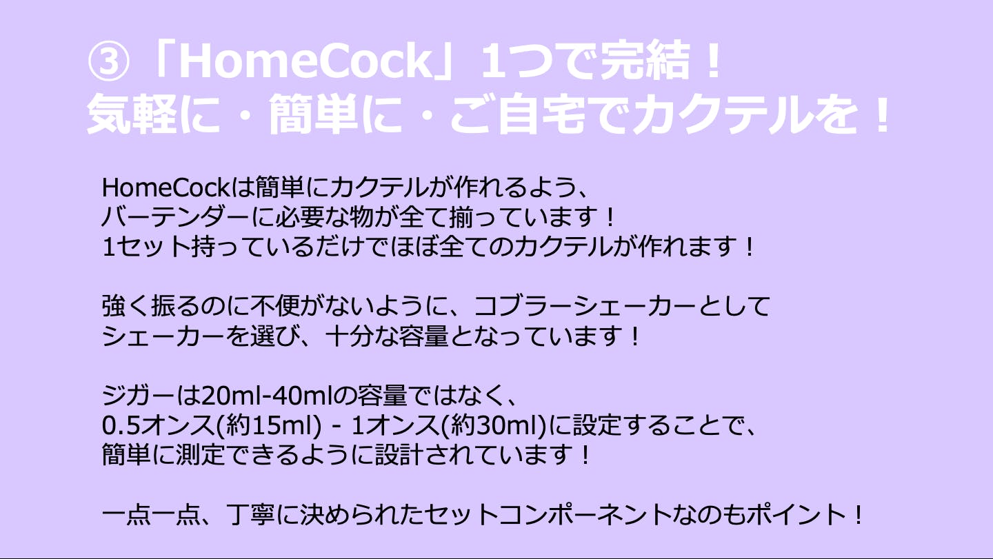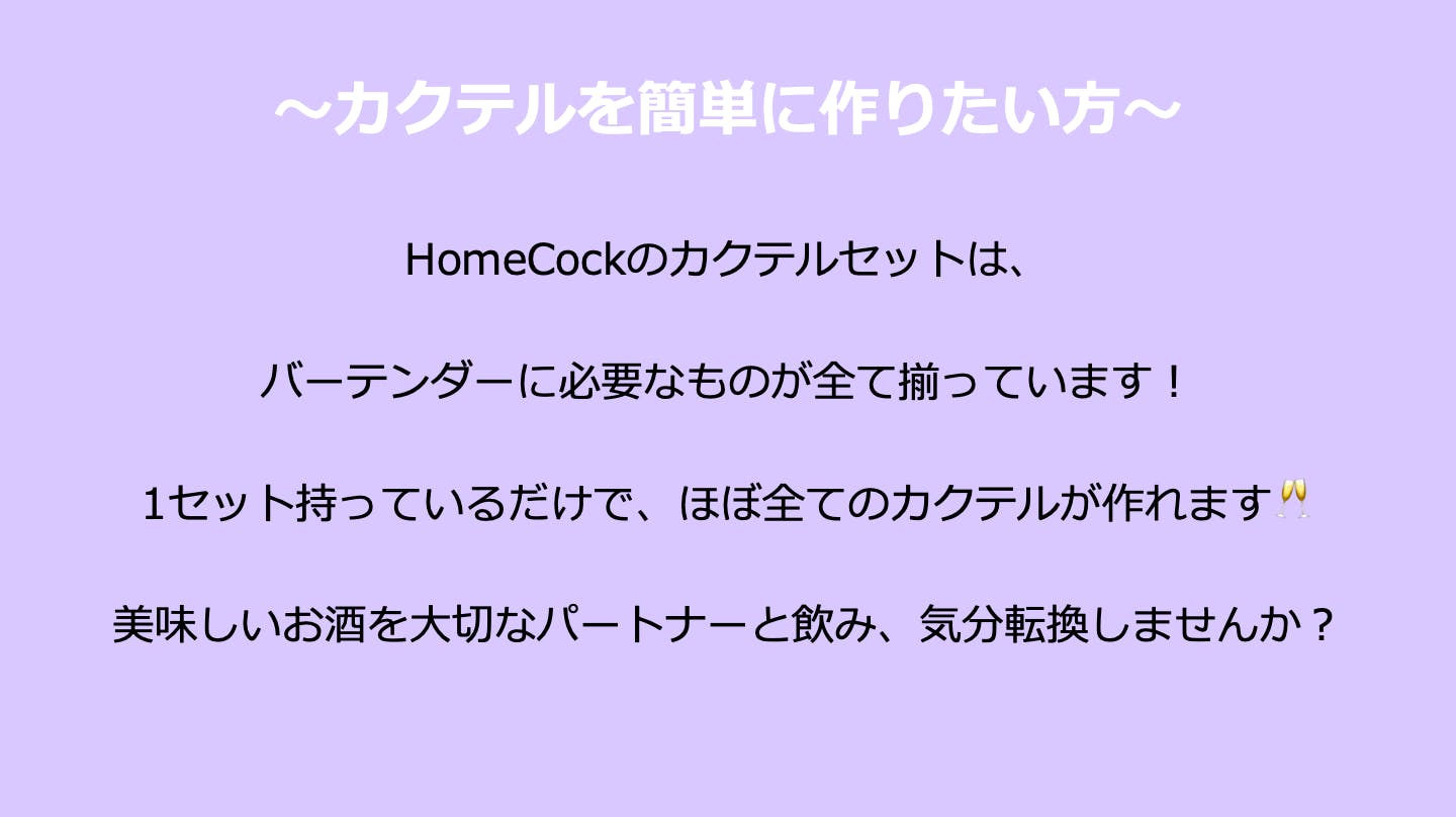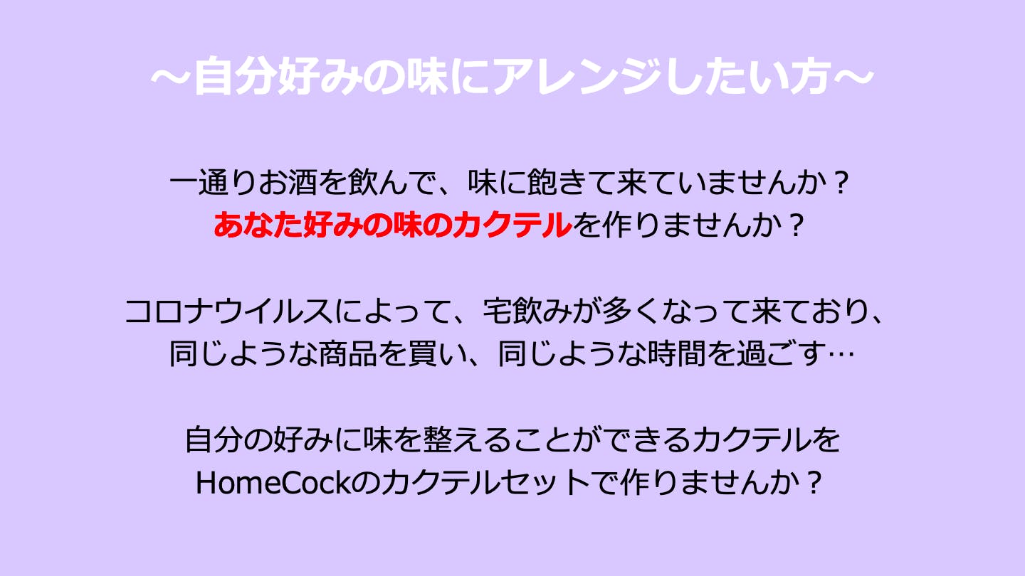 カクテルはプロに作ってもらった方が美味しいかもしれませんが、HomeCockでは自分の好みに合わせて作ることができますし、何よりも自分で作ることによって、意味ある物になると考えています。
