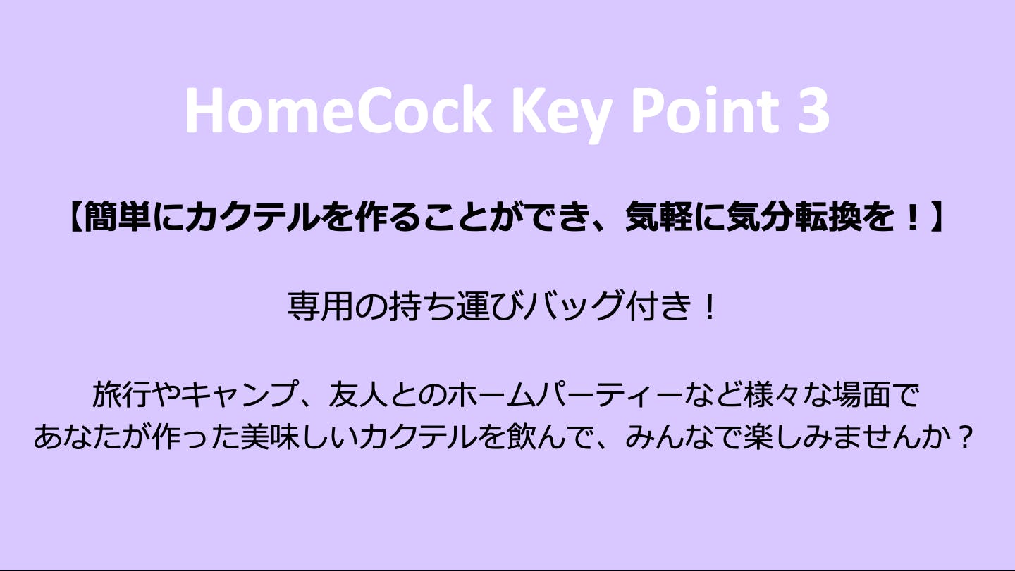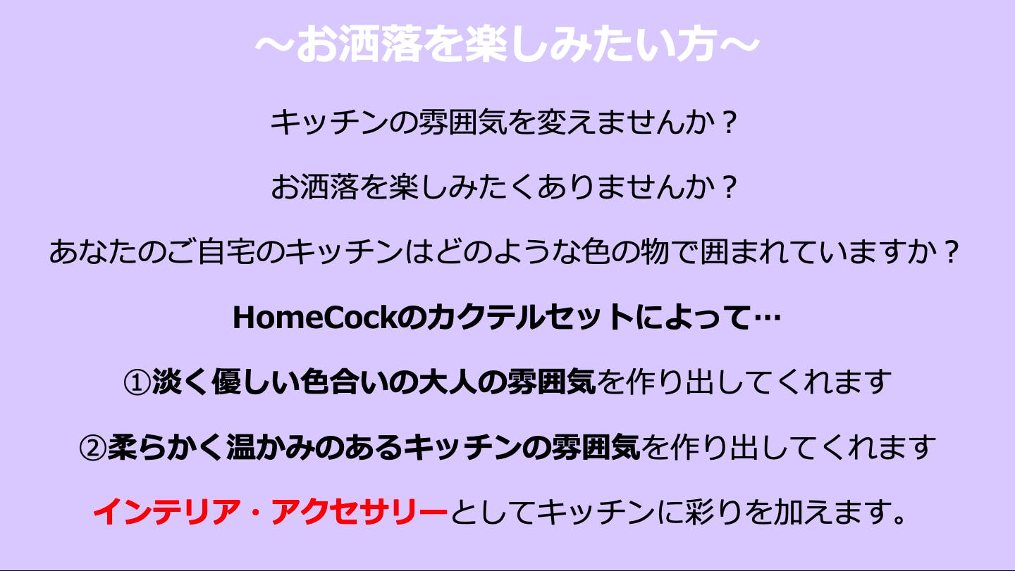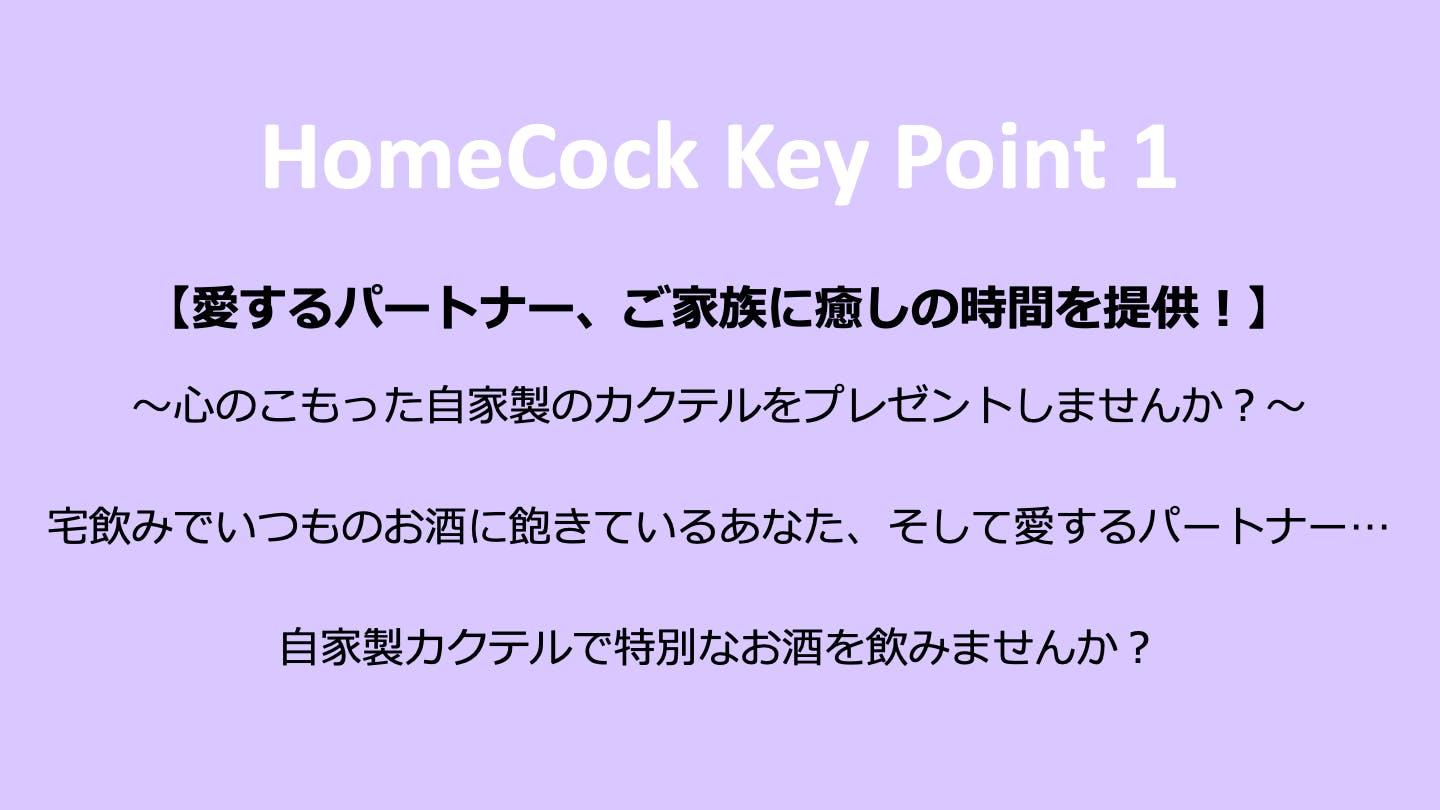 カクテルはプロに作ってもらった方が美味しいかもしれませんが、HomeCockでは自分の好みに合わせて作ることができますし、何よりも自分で作ることによって、意味ある物になると考えています。
