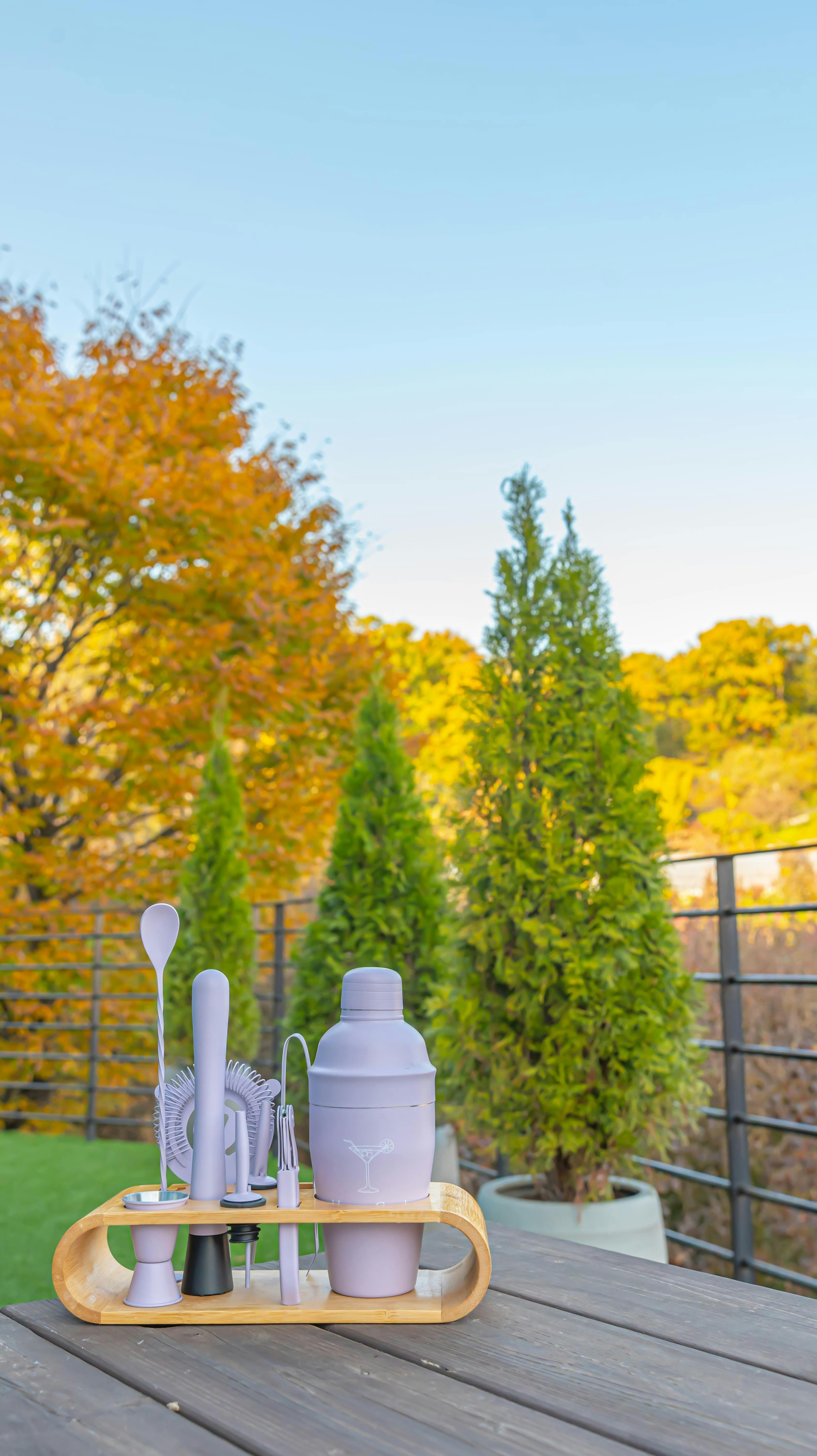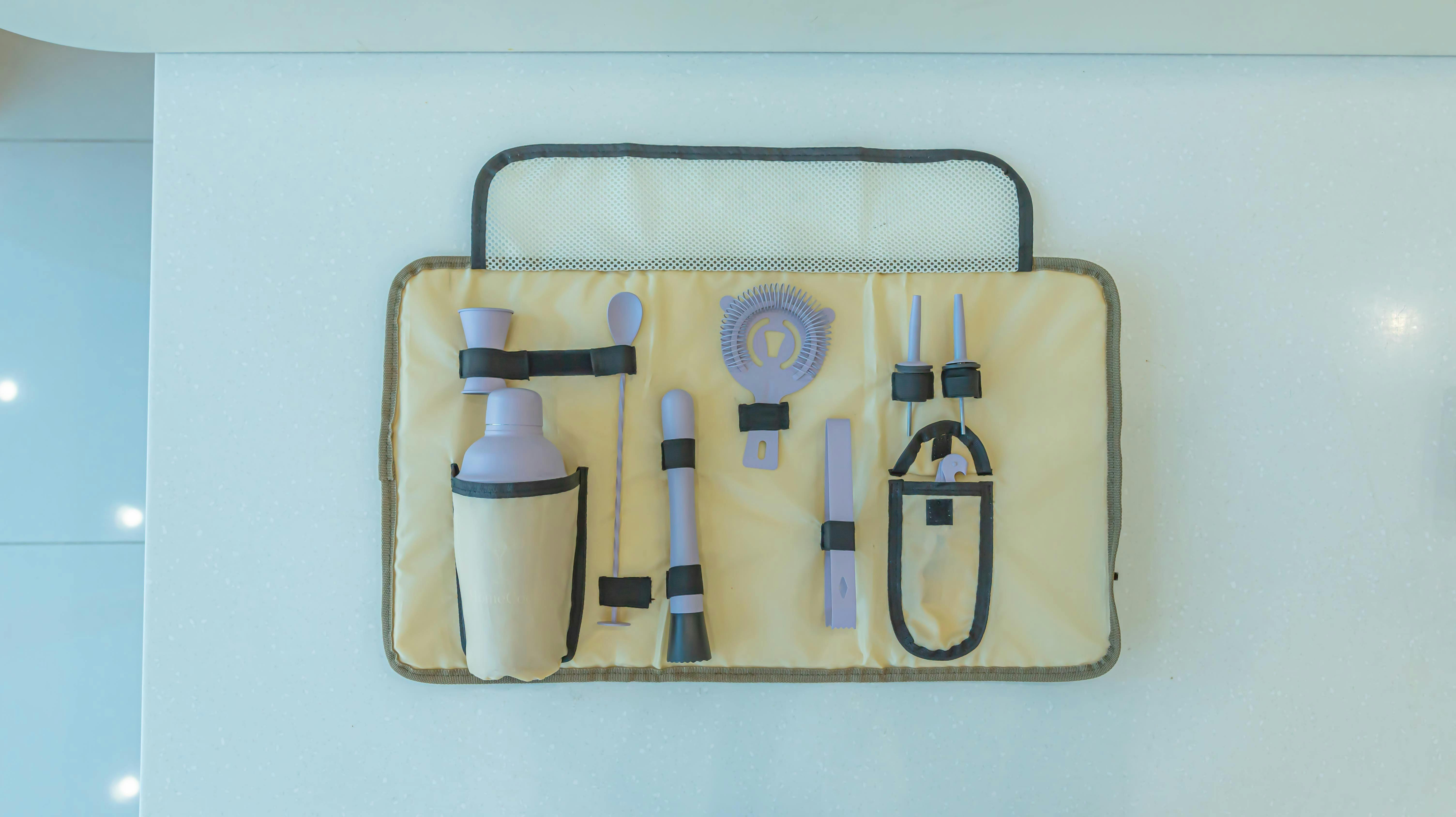シェーカー(700ml) | ジガー(15ml-30ml) | バースプーン | マドラー | 氷トング | ワインオープナー | ストレーナー | ポアラー2個 | 竹のスタンド | 専用バッグ