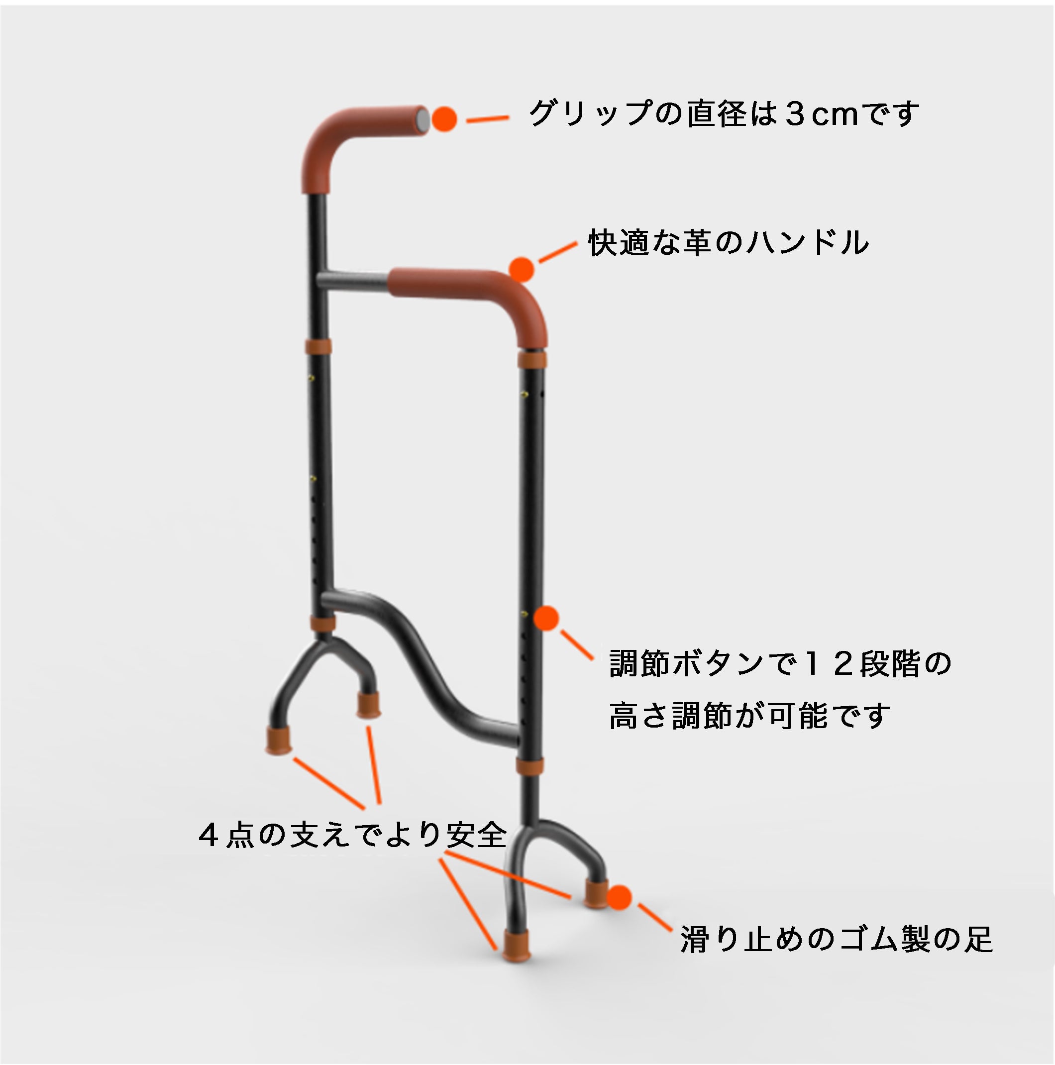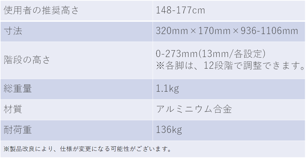 ・高さ調節押ボタンにより、足の長さを調整することができ、様々な階段に適応させることが可能です。※12段階の調整が可能