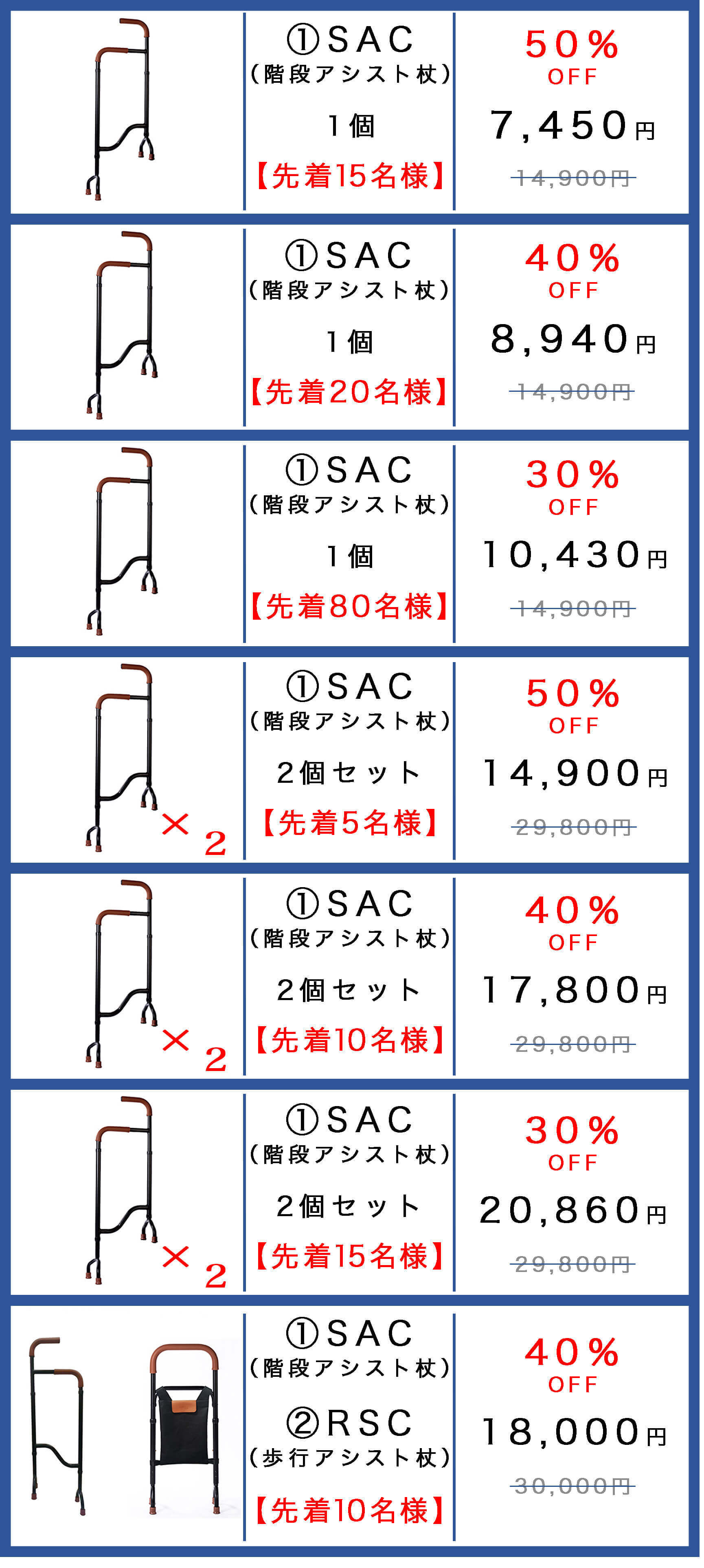 私どもは、本商品であるSACが、高齢者や足の不自由な方、骨折などの怪我をされた方、リハビリ中の方など、老若男女の救世主になると考えています。階段の上り下りだけが課題ではありません。階段専用の杖(手すり)以外にも、普段の生活を助けるアイテムがあります。