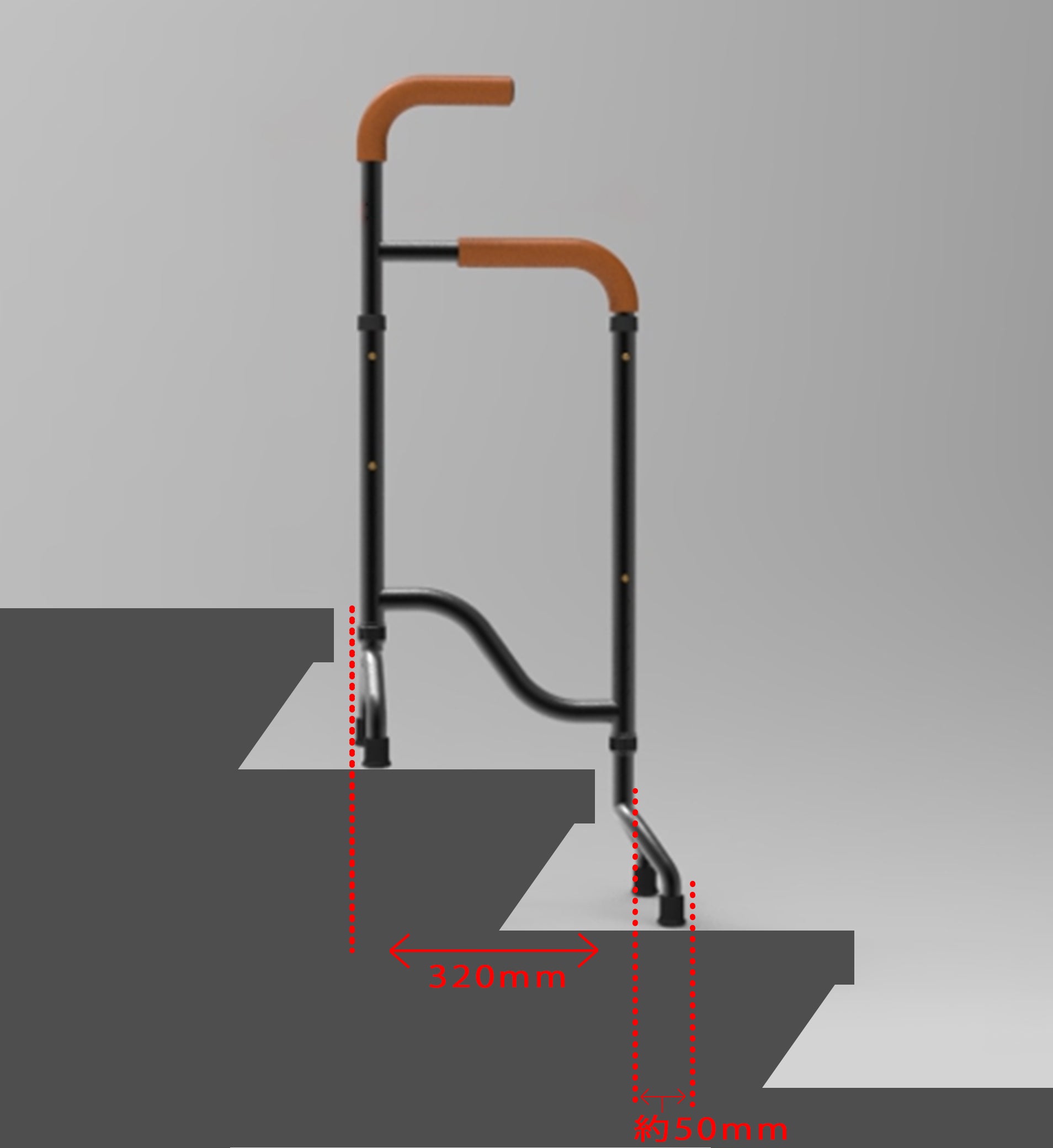 ・階段を上り下りする姿勢に合わせて、上下のハンドルを持ちます。グリップは、直径3cm。