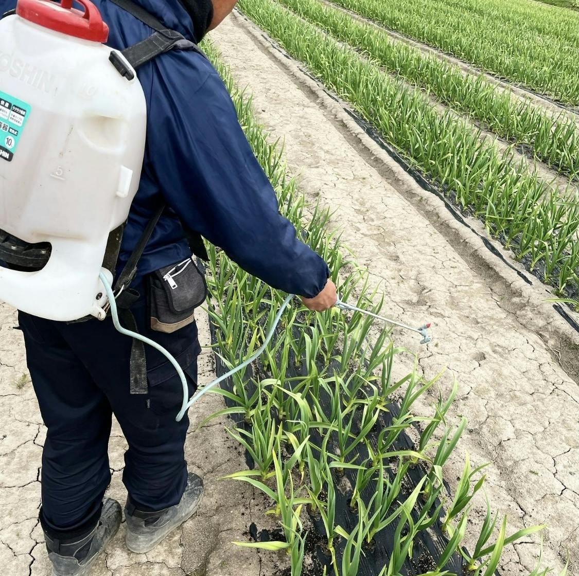 ダイヤモンドにんにく栽培の秘密・・・"お魚エキスの葉面散布"のひとコマ。